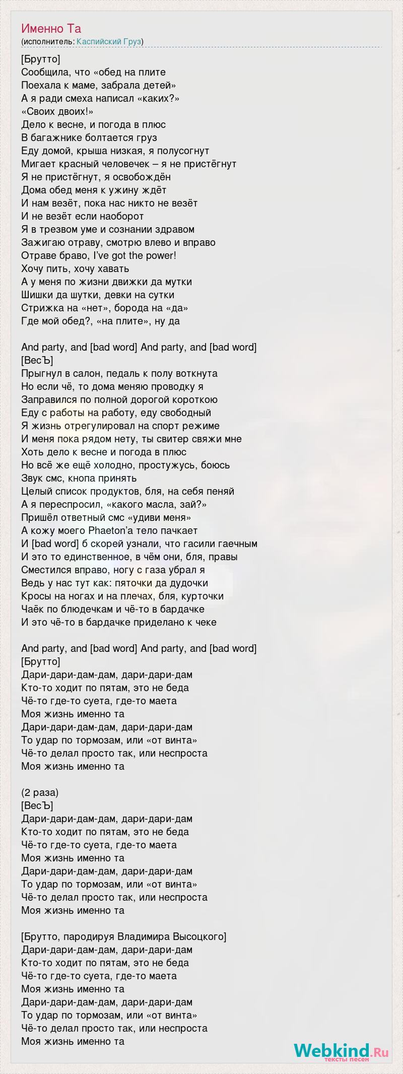 [Брутто] Сообщила, что «обед на плите Поехала к маме, забрала детей» А я ради смеха написал «каких?» «Своих двоих!» Дело к весне, и погода в плюс В багажнике болтается груз Еду домой, крыша низкая, я полусогнут Мигает красный человечек – я не пристёгнут Я не пристёгнут, я освобождён Дома обед меня к ужину ждёт И нам везёт, пока нас никто не везёт И не везёт если наоборот Я в трезвом уме и сознании здравом Зажигаю отраву, смотрю влево и вправо Отраве браво, I’ve got the power! Хочу пить, хочу хавать А у меня по жизни движки да мутки Шишки да шутки, девки на сутки Стрижка на «нет», борода на «да» Где мой обед?, «на плите», ну да And party, and [bad word] And party, and [bad word] [ВесЪ] Прыгнул в салон, педаль к полу воткнута Но если чё, то дома меняю проводку я Заправился по полной дорогой короткою Еду с работы на работу, еду свободный Я жизнь отрегулировал на спорт режиме И меня пока рядом нету, ты свитер свяжи мне Хоть дело к весне и погода в плюс Но всё же ещё холодно, простужусь, боюсь Звук смс, кнопа принять Целый список продуктов, бля, на себя пеняй А я переспросил, «какого масла, зай?» Пришёл ответный смс «удиви меня» А кожу моего Phaeton’а тело пачкает И [bad word] б скорей узнали, что гасили гаечным И это то единственное, в чём они, бля, правы Сместился вправо, ногу с газа убрал я Ведь у нас тут как: пяточки да дудочки Кросы на ногах и на плечах, бля, курточки Чаёк по блюдечкам и чё-то в бардачке И это чё-то в бардачке приделано к чеке And party, and [bad word] And party, and [bad word] [Брутто] Дари-дари-дам-дам, дари-дари-дам Кто-то ходит по пятам, это не беда Чё-то где-то суета, где-то маета Моя жизнь именно та Дари-дари-дам-дам, дари-дари-дам То удар по тормозам, или «от винта» Чё-то делал просто так, или неспроста Моя жизнь именно та (2 раза) [ВесЪ] Дари-дари-дам-дам, дари-дари-дам Кто-то ходит по пятам, это не беда Чё-то где-то суета, где-то маета Моя жизнь именно та Дари-дари-дам-дам, дари-дари-дам То удар по тормозам, или «от винта» Чё-то делал просто так, или неспроста Моя жизнь именно та [Брутто, пародируя Владимира Высоцкого] Дари-дари-дам-дам, дари-дари-дам Кто-то ходит по пятам, это не беда Чё-то где-то суета, где-то маета Моя жизнь именно та Дари-дари-дам-дам, дари-дари-дам То удар по тормозам, или «от винта» Чё-то делал просто так, или неспроста Моя жизнь именно та