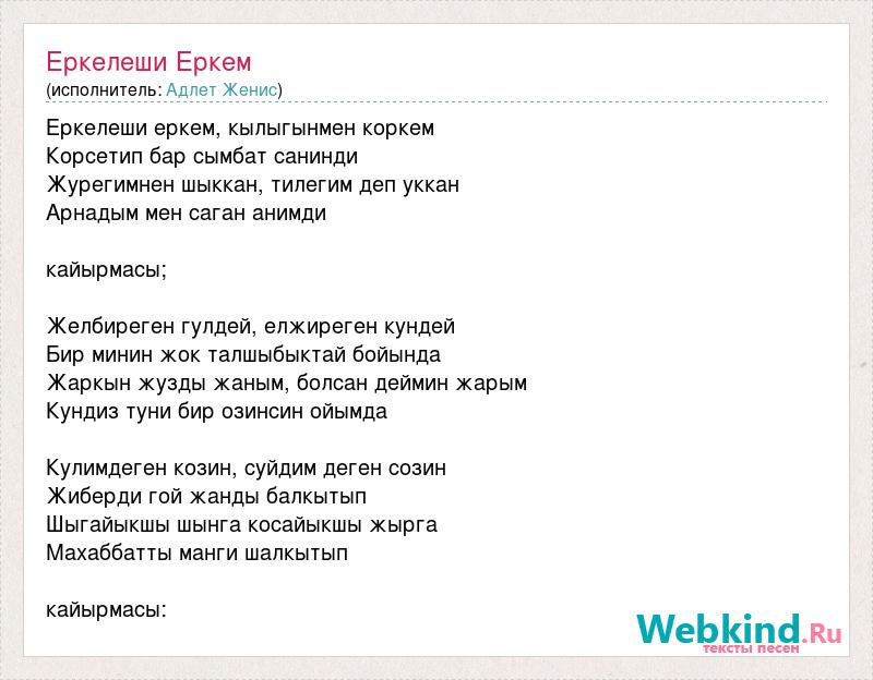 Еркелеши еркем, кылыгынмен коркем Корсетип бар сымбат санинди Журегимнен шыккан, тилегим деп уккан Арнадым мен саган анимди кайырмасы; Желбиреген гулдей, елжиреген кундей Бир минин жок талшыбыктай бойында Жаркын жузды жаным, болсан деймин жарым Кундиз туни бир озинсин ойымда Кулимдеген козин, суйдим деген созин Жиберди гой жанды балкытып Шыгайыкшы шынга косайыкшы жырга Махаббатты манги шалкытып кайырмасы: