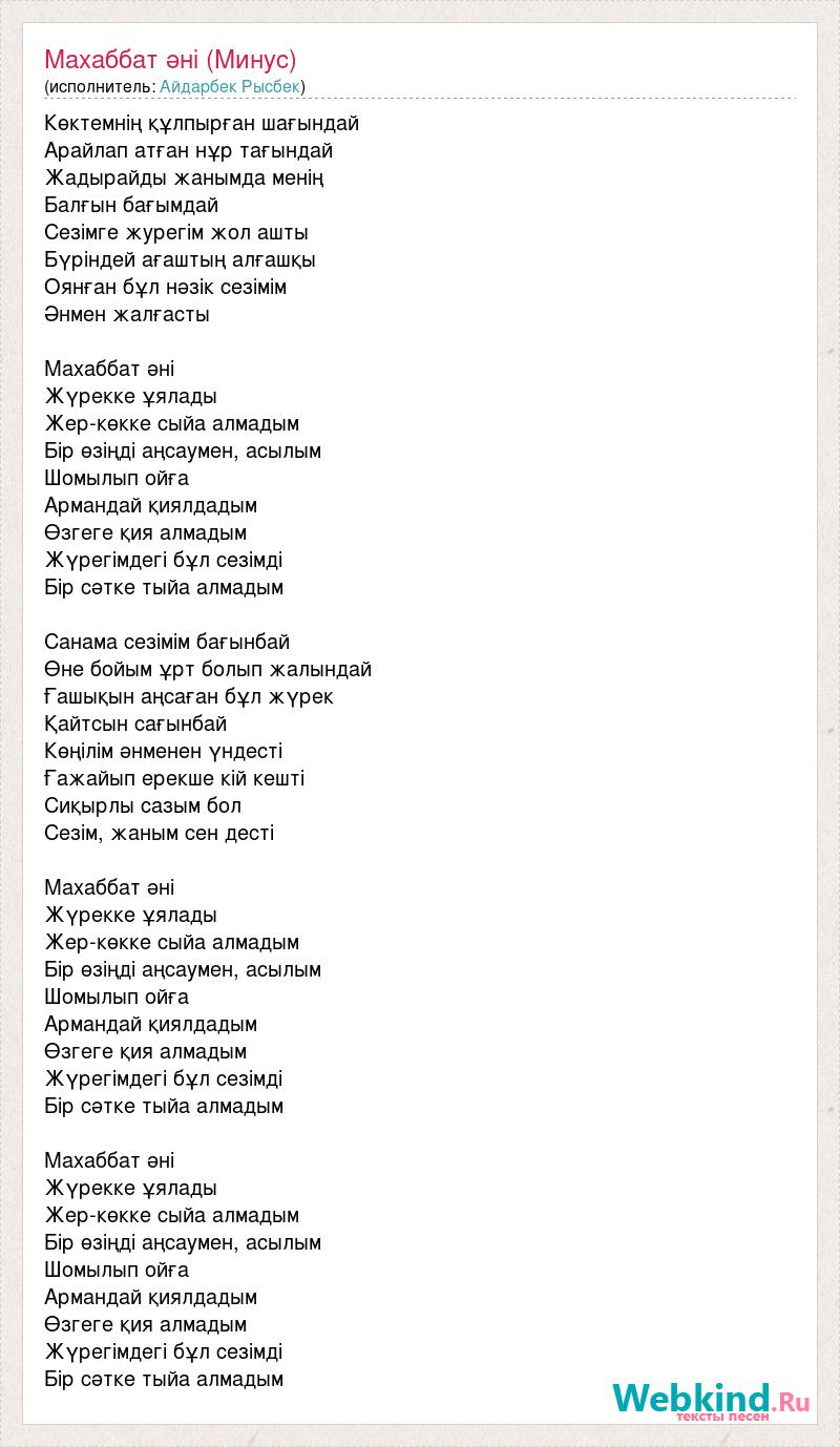 Көктемнің құлпырған шағындай Арайлап атған нұр тағындай Жадырайды жанымда менің Балғын бағымдай Сезімге журегім жол ашты Бүріндей ағаштың алғашқы Оянған бұл нәзік сезімім Әнмен жалғасты Махаббат әні Жүрекке ұялады Жер-көкке сыйа алмадым Бір өзіңді аңсаумен, асылым Шомылып ойға Армандай қиялдадым Өзгеге қия алмадым Жүрегімдегі бұл сезімді Бір сәтке тыйа алмадым Санама сезімім бағынбай Өне бойым ұрт болып жалындай Ғашықын аңсаған бұл жүрек Қайтсын сағынбай Көңілім әнменен үндесті Ғажайып ерекше кій кешті Сиқырлы сазым бол Сезім, жаным сен десті Махаббат әні Жүрекке ұялады Жер-көкке сыйа алмадым Бір өзіңді аңсаумен, асылым Шомылып ойға Армандай қиялдадым Өзгеге қия алмадым Жүрегімдегі бұл сезімді Бір сәтке тыйа алмадым Махаббат әні Жүрекке ұялады Жер-көкке сыйа алмадым Бір өзіңді аңсаумен, асылым Шомылып ойға Армандай қиялдадым Өзгеге қия алмадым Жүрегімдегі бұл сезімді Бір сәтке тыйа алмадым