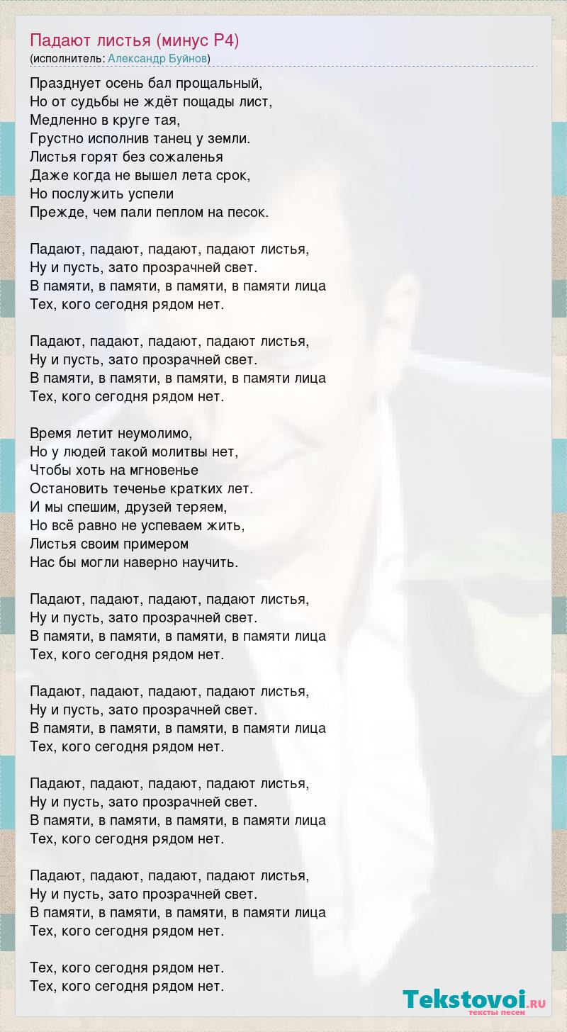 Празднует осень бал прощальный, Но от судьбы не ждёт пощады лист, Медленно в круге тая, Грустно исполнив танец у земли. Листья горят без сожаленья Даже когда не вышел лета срок, Но послужить успели Прежде, чем пали пеплом на песок. Падают, падают, падают, падают листья, Ну и пусть, зато прозрачней свет. В памяти, в памяти, в памяти, в памяти лица Тех, кого сегодня рядом нет. Падают, падают, падают, падают листья, Ну и пусть, зато прозрачней свет. В памяти, в памяти, в памяти, в памяти лица Тех, кого сегодня рядом нет. Время летит неумолимо, Но у людей такой молитвы нет, Чтобы хоть на мгновенье Остановить теченье кратких лет. И мы спешим, друзей теряем, Но всё равно не успеваем жить, Листья своим примером Нас бы могли наверно научить. Падают, падают, падают, падают листья, Ну и пусть, зато прозрачней свет. В памяти, в памяти, в памяти, в памяти лица Тех, кого сегодня рядом нет. Падают, падают, падают, падают листья, Ну и пусть, зато прозрачней свет. В памяти, в памяти, в памяти, в памяти лица Тех, кого сегодня рядом нет. Падают, падают, падают, падают листья, Ну и пусть, зато прозрачней свет. В памяти, в памяти, в памяти, в памяти лица Тех, кого сегодня рядом нет. Падают, падают, падают, падают листья, Ну и пусть, зато прозрачней свет. В памяти, в памяти, в памяти, в памяти лица Тех, кого сегодня рядом нет. Тех, кого сегодня рядом нет. Тех, кого сегодня рядом нет.