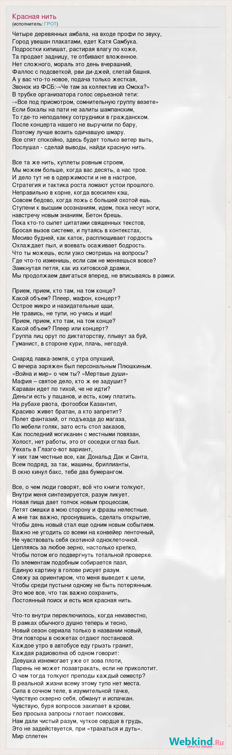 Четыре деревянных амбала, на входе профи по звуку, Город увешан плакатами, едет Катя Самбука. Подростки кипишат, растирая влагу по коже, Та продает задницу, те отбивают вложенное. Нет сложного, мораль это день вчерашний, Фаллос с подсветкой, рви ди-джей, слетай башня. А у вас что-то новое, подача только жесткая, Звонок из ФСБ:-«Че там за коллектив из Омска?» В трубке организатора голос серьезной тети: -«Все под присмотром, сомнительную группу везете» Если бокалы на пати не залиты шампанским, То где-то неподалеку сотрудники в гражданском. После концерта нашего не выручили по бару, Поэтому лучше возить одичавшую шмару. Все спят спокойно, здесь будет только ветер выть, Послушал - сделай выводы, найди красную нить. Все та же нить, куплеты ровным строем, Мы можем больше, когда вас десять, а нас трое. И дело тут не в одержимости и не в настрое, Стратегия и тактика роста ломают устои прошлого. Неправильно в корне, когда всесилен кэш, Совсем бедово, когда ложь с большей охотой ешь. Ступени к высшим осознаниям, идем, пока несут ноги, навстречу новым знаниям, Бетон брешь. Пока кто-то сыпет цитатами священных текстов, Бросая вызов системе, и путаясь в контекстах, Месиво будней, как каток, расплющивает гордость Охлаждает пыл, и воевать осаживает бодрость. Что ты можешь, если узко смотришь на вопросы? Где что-то изменишь, если сам не меняешься вовсе? Замкнутая петля, как из китовской драмки, Мы продолжаем двигаться вперед, не вписываясь в рамки. Прием, прием, кто там, на том конце? Какой объем? Плеер, мафон, концерт? Острое микро и назидательные щщи, Не травись, не тупи, но учись и ищи! Прием, прием, кто там, на том конце? Какой объем? Плеер или концерт? Группа лиц орут по диктаторству, плывут за буй, Гуманист, в стороне кури, плачь, негодуй. Снаряд лавка-земля, с утра опухший, С вечера заряжен был персональным Плюшкиным. «Война и мир» о чем ты? «Мертвые души» Мафия – святое дело, кто ж ее задушит? Караван идет по тихой, че не идти? Деньги есть у пацанов, и есть, кому платить. На рубахе рвота, фотообои Казантип, Красиво живет братан, а кто запретит? Полет фантазий, от подъезда до магаза, По мебели голяк, зато есть стол заказов, Как последний могиканин с местными повязан, Холост, нет работы, это от соседки сглаз был. Уехать в Глазго-вот вариант, У них там честные все, как Дональд Дак и Санта, Всем подряд, за так, машины, бриллианты, В окно кинул бакс, тебе два бумерангом. Все, о чем люди говорят, всё что книги толкуют, Внутри меня синтезируется, разум ликует. Новая пища дает толчок новым процессам, Летят смешки в мою сторону и фразы нелестные. А мне так важно, проснувшись, сделать открытие, Чтобы день новый стал еще одним новым событием. Важно не угодить со всеми на конвейер ленточный, Не чувствовать себя скотиной одноклеточной. Цепляясь за любое зерно, настолько крепко, Чтобы потом его подвергнуть тотальной проверке. По элементам подобным собирается пазл, Единую картину в голове рисует разум. Слежу за ориентиром, что меня выведет к цели, Чтобы среди пустыни одному не быть потерянным. Это мое все, что так важно сохранить, Постоянный поиск и есть моя красная нить. Что-то внутри переключилось, когда неизвестно, В рамках обычного душно теперь и тесно, Новый сезон сериала только в названии новый, Эти повторы в сюжетах отдают постановой. Каждое утро в автобусе еду грызть гранит, Каждая радиоволн