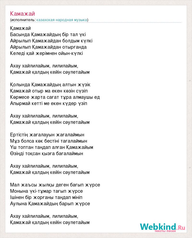 Қамажай Басында Қамажайдың бір тал үкі Айрылып Қамажайдан болдым күлкі Айрылып Қамажайдан отырғанда Келеді қай жерімнен ойын-күлкі Ахау хайлилайым, лилилайым, Қамажай қалдың кейін сәулетайым Қолында Қамажайдың алтын жүзік Қамажай отыр ма екен көзін сүзіп Көрмесе жарта сағат тұра алмаушы ед Апырмай кетті ме екен күдер үзіп Ахау хайлилайым, лилилайым, Қамажай қалдың кейін сәулетайым Ертістің жағалауын жағалаймын Мұз болса көк бестіні тағалаймын Үш топтан таңдап алған Қамажайым Өзіңді тоқсан қызға бағалаймын Ахау хайлилайым, лилилайым, Қамажай қалдың кейін сәулетайым Мал жаъсы жылқы деген бағып жүрсе Монына үкі-тұмар тағып жүрсе Ішінен бір жорғаны таңдап мініп Аулына Қамажайдың барып жүрсе Ахау хайлилайым, лилилайым, Қамажай қалдың кейін сәулетайым