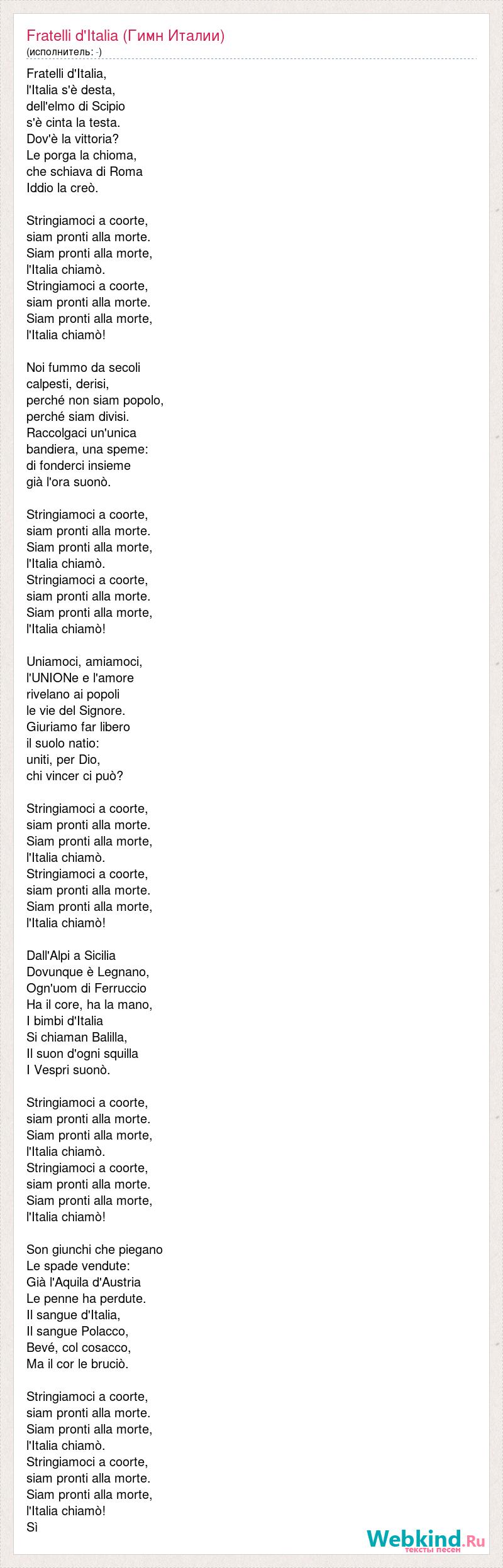 Fratelli d'Italia, l'Italia s'è desta, dell'elmo di Scipio s'è cinta la testa. Dov'è la vittoria? Le porga la chioma, che schiava di Roma Iddio la creò. Stringiamoci a coorte, siam pronti alla morte. Siam pronti alla morte, l'Italia chiamò. Stringiamoci a coorte, siam pronti alla morte. Siam pronti alla morte, l'Italia chiamò! Noi fummo da secoli calpesti, derisi, perché non siam popolo, perché siam divisi. Raccolgaci un'unica bandiera, una speme: di fonderci insieme già l'ora suonò. Stringiamoci a coorte, siam pronti alla morte. Siam pronti alla morte, l'Italia chiamò. Stringiamoci a coorte, siam pronti alla morte. Siam pronti alla morte, l'Italia chiamò! Uniamoci, amiamoci, l'UNIОNe e l'amore rivelano ai popoli le vie del Signore. Giuriamo far libero il suolo natio: uniti, per Dio, chi vincer ci può? Stringiamoci a coorte, siam pronti alla morte. Siam pronti alla morte, l'Italia chiamò. Stringiamoci a coorte, siam pronti alla morte. Siam pronti alla morte, l'Italia chiamò! Dall'Alpi a Sicilia Dovunque è Legnano, Ogn'uom di Ferruccio Ha il core, ha la mano, I bimbi d'Italia Si chiaman Balilla, Il suon d'ogni squilla I Vespri suonò. Stringiamoci a coorte, siam pronti alla morte. Siam pronti alla morte, l'Italia chiamò. Stringiamoci a coorte, siam pronti alla morte. Siam pronti alla morte, l'Italia chiamò! Son giunchi che piegano Le spade vendute: Già l'Aquila d'Austria Le penne ha perdute. Il sangue d'Italia, Il sangue Polacco, Bevé, col cosacco, Ma il cor le bruciò. Stringiamoci a coorte, siam pronti alla morte. Siam pronti alla morte, l'Italia chiamò. Stringiamoci a coorte, siam pronti alla morte. Siam pronti alla morte, l'Italia chiamò! Sì
