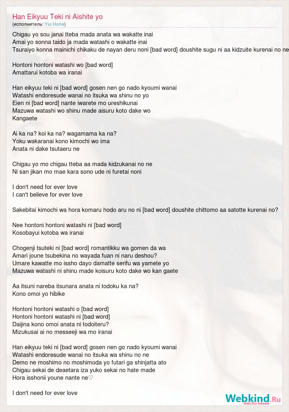 Chigau yo sou janai tteba mada anata wa wakatte inai Amai yo sonna taido ja mada watashi o wakatte inai Tsuraiyo konna mainichi chikaku de nayan deru noni [bad word] doushite sugu ni aa kidzuite kurenai no ne Hontoni hontoni watashi wo [bad word] Amattarui kotoba wa iranai Han eikyuu teki ni [bad word] gosen nen go nado kyoumi wanai Watashi endoresude wanai no itsuka wa shinu no yo Eien ni [bad word] nante iwarete mo ureshikunai Mazuwa watashi wo shinu made aisuru koto dake wo Kangaete Ai ka na? koi ka na? wagamama ka na? Yoku wakaranai kono kimochi wo ima Anata ni dake tsutaeru ne Chigau yo mo chigau tteba aa mada kidzukanai no ne Ni san jikan mo mae kara sono ude ni furetai noni I don't need for ever love I can't believe for ever love Sakebitai kimochi wa hora komaru hodo aru no ni [bad word] doushite chittomo aa satotte kurenai no? Nee hontoni hontoni watashi ni [bad word] Kosobayui kotoba wa iranai Chogenji tsuteki ni [bad word] romantikku wa gomen da wa Amari joune tsubekina no wayada fuan ni naru deshou? Umare kawatte mo issho dayo damatte serifu wa yamete yo Mazuwa watashi ni shinu made koisuru koto dake wo kan gaete Aa itsuni nareba itsunara anata ni todoku ka na? Kono omoi yo hibike Hontoni hontoni watashi o [bad word] Hontoni hontoni watashi ni [bad word] Daijina kono omoi anata ni todoiteru? Mizukusai ai no messeeji wa mo iranai Han eikyuu teki ni [bad word] gosen nen go nado kyoumi wanai Watashi endoresude wanai no itsuka wa shinu no ne Demo ne moshimo no moshimoda yo futari ga shinjatta ato Chigau sekai de deaetara iza yuko sekai no hate made Hora isshonii youne nante ne♡ I don't need for ever love