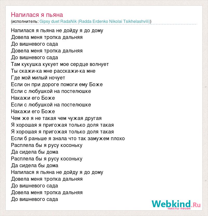 Напилася я пьяна не дойду я до дому Довела меня тропка дальняя До вишневого сада Довела меня тропка дальняя До вишневого сада Там кукушка кукует мое сердце волнует Ты скажи-ка мне расскажи-ка мне Где мой милый ночует Если он при дороге помоги ему Боже Если с любушкой на постелюшке Накажи его Боже Если с любушкой на постелюшке Накажи его Боже Чем же я не такая чем чужая другая Я хорошая я пригожая только доля такая Я хорошая я пригожая только доля такая Если б раньше я знала что так замужем плохо Расплела бы я русу косоньку Да сидела бы дома Расплела бы я русу косоньку Да сидела бы дома Напилася я пьяна не дойду я до дому Довела меня тропка дальняя До вишневого сада Довела меня тропка дальняя До вишневого сада