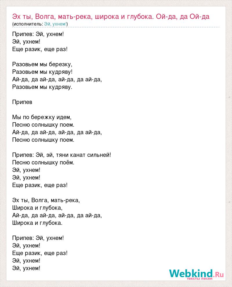 Припев: Эй, ухнем! Эй, ухнем! Еще разик, еще раз! Разовьем мы березку, Разовьем мы кудряву! Ай-да, да ай-да, ай-да, да ай-да, Разовьем мы кудряву. Припев Мы по бережку идем, Песню солнышку поем. Ай-да, да ай-да, ай-да, да ай-да, Песню солнышку поем. Припев: Эй, эй, тяни канат сильней! Песню солнышку поём. Эй, ухнем! Эй, ухнем! Еще разик, еще раз! Эх ты, Волга, мать-река, Широка и глубока, Ай-да, да ай-да, ай-да, да ай-да, Широка и глубока. Припев: Эй, ухнем! Эй, ухнем! Еще разик, еще раз! Эй, ухнем! Эй, ухнем!