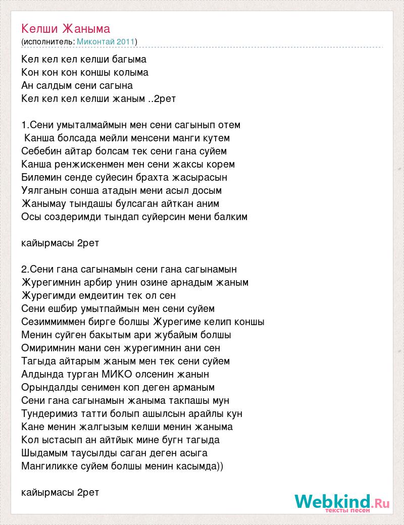 Кел кел кел келши багыма Кон кон кон коншы колыма Ан салдым сени сагына Кел кел кел келши жаным ..2рет 1.Сени умыталмаймын мен сени сагынып отем Канша болсада мейли менсени манги кутем Себебин айтар болсам тек сени гана суйем Канша ренжискенмен мен сени жаксы корем Билемин сенде суйесин брахта жасырасын Уялганын сонша атадын мени асыл досым Жанымау тындашы булсаган айткан аним Осы создеримди тындап суйерсин мени балким кайырмасы 2рет 2.Сени гана сагынамын сени гана сагынамын Журегимнин арбир унин озине арнадым жаным Журегимди емдеитин тек ол сен Сени ешбир умытпаймын мен сени суйем Сезиммиммен бирге болшы Журегиме келип коншы Менин суйген бакытым ари жубайым болшы Омиримнин мани сен журегимнин ани сен Тагыда айтарым жаным мен тек сени суйем Алдында турган МИКО олсенин жанын Орындалды сенимен коп деген арманым Сени гана сагынамын жаныма такпашы мун Тундеримиз татти болып ашылсын арайлы кун Кане менин жалгызым келши менин жаныма Кол ыстасып ан айтйык мине бугн тагыда Шыдамым таусылды саган деген асыга Мангиликке суйем болшы менин касымда)) кайырмасы 2рет