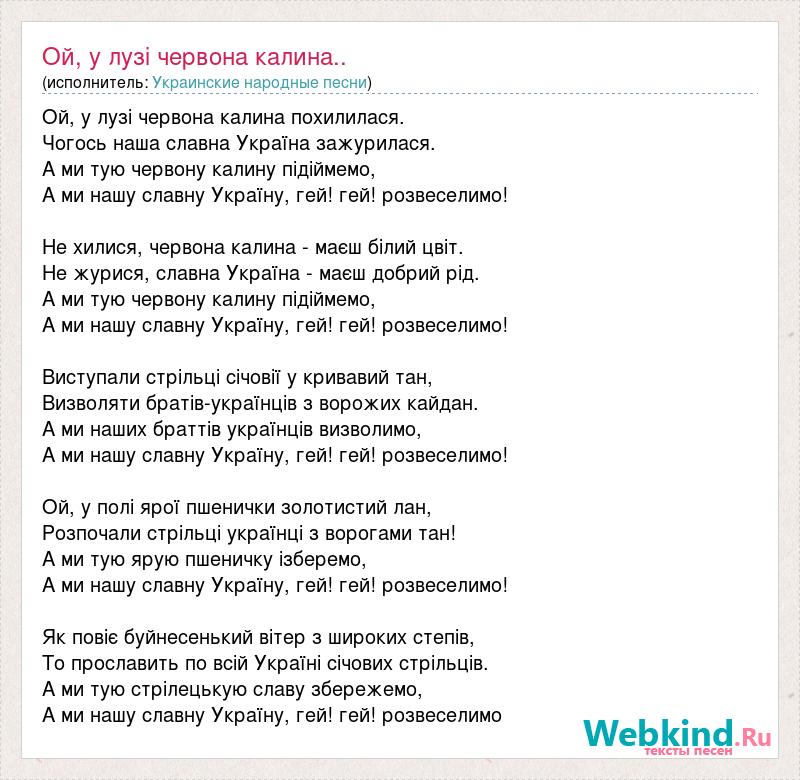 Ой, у лузі червона калина похилилася. Чогось наша славна Україна зажурилася. А ми тую червону калину підіймемо, А ми нашу славну Україну, гей! гей! розвеселимо! Не хилися, червона калина - маєш білий цвіт. Не журися, славна Україна - маєш добрий рід. А ми тую червону калину підіймемо, А ми нашу славну Україну, гей! гей! розвеселимо! Виступали стрільці січовії у кривавий тан, Визволяти братів-українців з ворожих кайдан. А ми наших браттів українців визволимо, А ми нашу славну Україну, гей! гей! розвеселимо! Ой, у полі ярої пшенички золотистий лан, Розпочали стрільці українці з ворогами тан! А ми тую ярую пшеничку ізберемо, А ми нашу славну Україну, гей! гей! розвеселимо! Як повіє буйнесенький вітер з широких степів, То прославить по всій Україні січових стрільців. А ми тую стрілецькую славу збережемо, А ми нашу славну Україну, гей! гей! розвеселимо