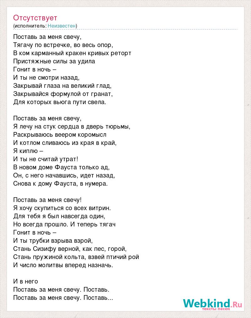 Поставь за меня свечу, Тягачу по встречке, во весь опор, В ком карманный кракен кривых реторт Пристяжные силы за удила Гонит в ночь – И ты не смотри назад, Закрывай глаза на великий глад, Закрывайся формулой от гранат, Для которых вьюга пути свела. Поставь за меня свечу, Я лечу на стук сердца в дверь тюрьмы, Раскрываюсь веером коромысл И котлом сливаюсь из края в край, Я киплю – И ты не считай утрат! В новом доме Фауста только ад, Он, с него начавшись, идет назад, Снова к дому Фауста, в нумера. Поставь за меня свечу! Я хочу скупиться со всех витрин. Для тебя я был навсегда один, Но всегда прошло. И теперь тягач Гонит в ночь – И ты трубки взрыва взрой, Стань Сизифу верной, как пес, горой, Стань пружиной кольта, взвей птичий рой И число молитвы вперед назначь. И в него Поставь за меня свечу. Поставь. Поставь за меня свечу. Поставь...