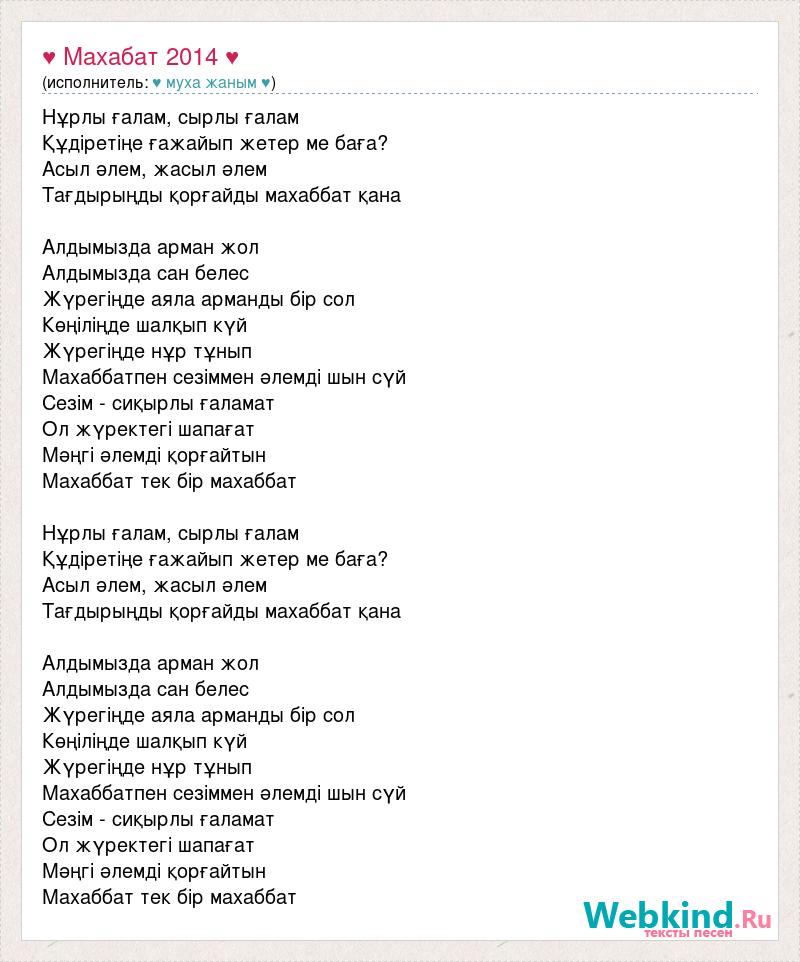 Нұрлы ғалам, сырлы ғалам Құдіретіңе ғажайып жетер ме баға? Асыл әлем, жасыл әлем Тағдырыңды қорғайды махаббат қана Алдымызда арман жол Алдымызда сан белес Жүрегіңде аяла арманды бір сол Көңіліңде шалқып күй Жүрегіңде нұр тұнып Махаббатпен сезіммен әлемді шын сүй Сезім - сиқырлы ғаламат Ол жүректегі шапағат Мәңгі әлемді қорғайтын Махаббат тек бір махаббат Нұрлы ғалам, сырлы ғалам Құдіретіңе ғажайып жетер ме баға? Асыл әлем, жасыл әлем Тағдырыңды қорғайды махаббат қана Алдымызда арман жол Алдымызда сан белес Жүрегіңде аяла арманды бір сол Көңіліңде шалқып күй Жүрегіңде нұр тұнып Махаббатпен сезіммен әлемді шын сүй Сезім - сиқырлы ғаламат Ол жүректегі шапағат Мәңгі әлемді қорғайтын Махаббат тек бір махаббат