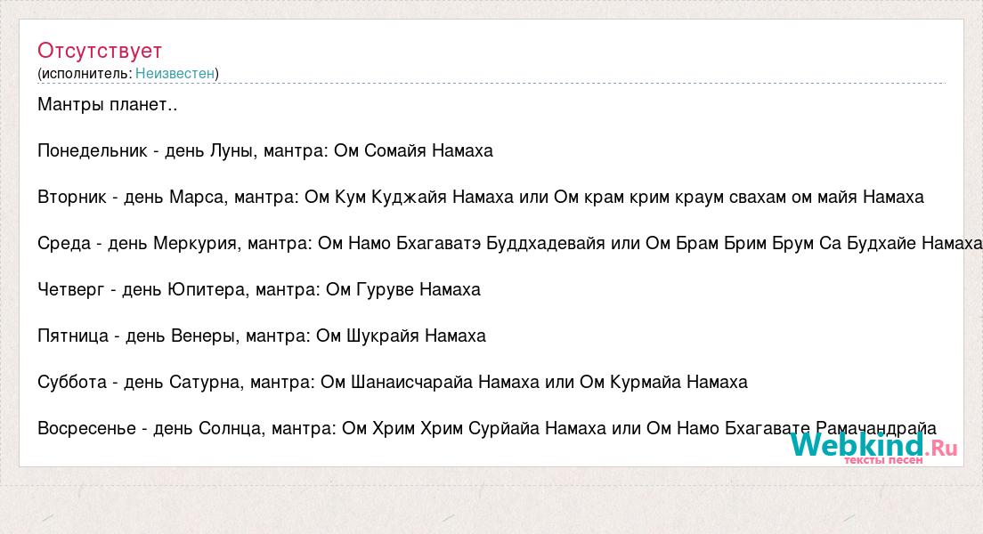 Мантры планет.. Понедельник - день Луны, мантра: Ом Сомайя Намаха Вторник - день Марса, мантра: Ом Кум Куджайя Намаха или Ом крам крим краум свахам ом майя Намаха Среда - день Меркурия, мантра: Ом Намо Бхагаватэ Буддхадевайя или Ом Брам Брим Брум Са Будхайе Намаха Четверг - день Юпитера, мантра: Ом Гуруве Намаха Пятница - день Венеры, мантра: Ом Шукрайя Намаха Суббота - день Сатурна, мантра: Ом Шанаисчарайа Намаха или Ом Курмайа Намаха Восресенье - день Солнца, мантра: Ом Хрим Хрим Сурйайа Намаха или Ом Намо Бхагавате Рамачандрайа