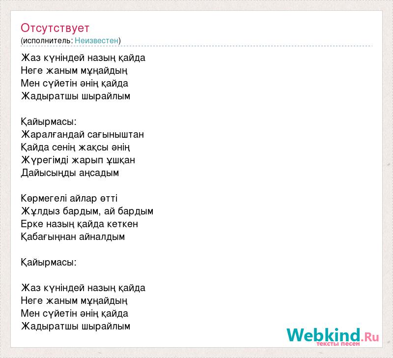 Жаз күніндей назың қайда Неге жаным мұңайдың Мен сүйетін әнің қайда Жадыратшы шырайлым Қайырмасы: Жаралғандай сағыныштан Қайда сенің жақсы әнің Жүрегімді жарып ұшқан Дайысыңды аңсадым Көрмегелі айлар өтті Жұлдыз бардым, ай бардым Ерке назың қайда кеткен Қабағыңнан айналдым Қайырмасы: Жаз күніндей назың қайда Неге жаным мұңайдың Мен сүйетін әнің қайда Жадыратшы шырайлым