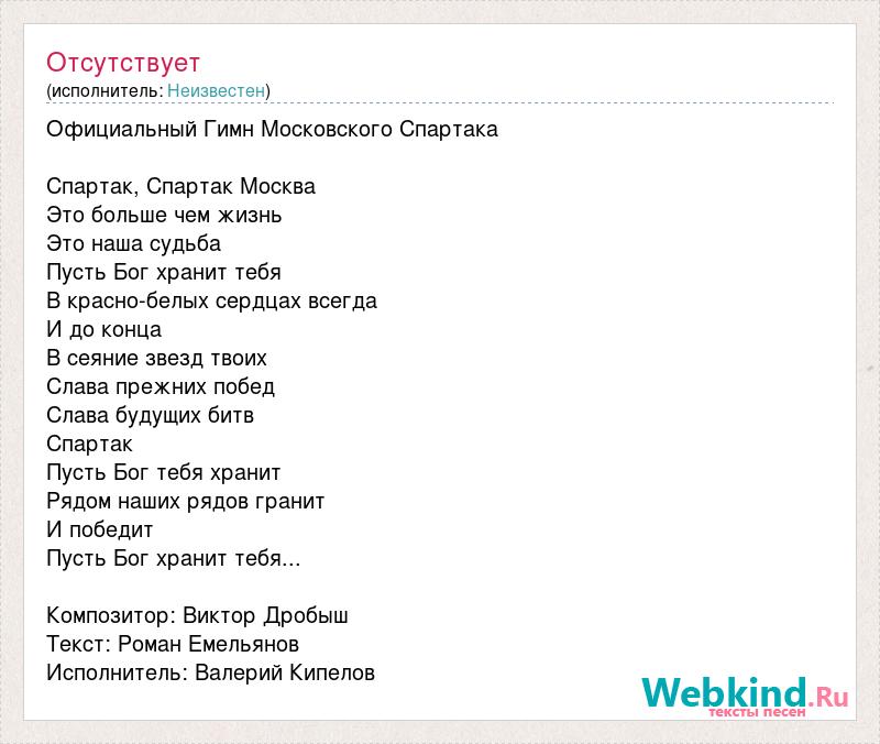 Официальный Гимн Московского Спартака Спартак, Спартак Москва Это больше чем жизнь Это наша судьба Пусть Бог хранит тебя В красно-белых сердцах всегда И до конца В сеяние звезд твоих Слава прежних побед Слава будущих битв Спартак Пусть Бог тебя хранит Рядом наших рядов гранит И победит Пусть Бог хранит тебя... Композитор: Виктор Дробыш Текст: Роман Емельянов Исполнитель: Валерий Кипелов