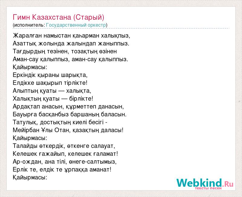 Жаралған намыстан қаһарман халықпыз, Азаттық жолында жалындап жаныппыз. Тағдырдың тезінен, тозақтың өзінен Аман-сау қалыппыз, аман-сау қалыппыз. Қайырмасы: Еркіндік қыраны шарықта, Елдікке шақырып тірлікте! Алыптың қуаты — халықта, Халықтың қуаты — бірлікте! Ардақтап анасын, құрметтеп данасын, Бауырға басқанбыз баршаның баласын. Татулық, достықтың киелі бесігі - Мейірбан Ұлы Отан, қазақтың даласы! Қайырмасы: Талайды өткердік, өткенге салауат, Келешек ғажайып, келешек ғаламат! Ар-ождан, ана тілі, өнеге-салтымыз, Ерлік те, елдік те ұрпаққа аманат! Қайырмасы:
