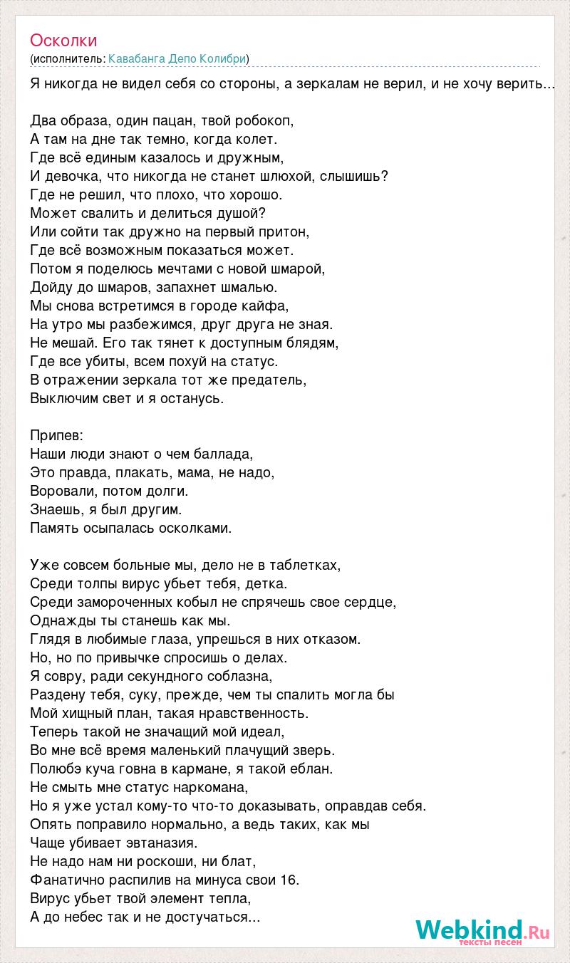 Я никогда не видел себя со стороны, а зеркалам не верил, и не хочу верить... Два образа, один пацан, твой робокоп, А там на дне так темно, когда колет. Где всё единым казалось и дружным, И девочка, что никогда не станет шлюхой, слышишь? Где не решил, что плохо, что хорошо. Может свалить и делиться душой? Или сойти так дружно на первый притон, Где всё возможным показаться может. Потом я поделюсь мечтами с новой шмарой, Дойду до шмаров, запахнет шмалью. Мы снова встретимся в городе кайфа, На утро мы разбежимся, друг друга не зная. Не мешай. Его так тянет к доступным блядям, Где все убиты, всем похуй на статус. В отражении зеркала тот же предатель, Выключим свет и я останусь. Припев: Наши люди знают о чем баллада, Это правда, плакать, мама, не надо, Воровали, потом долги. Знаешь, я был другим. Память осыпалась осколками. Уже совсем больные мы, дело не в таблетках, Среди толпы вирус убьет тебя, детка. Среди замороченных кобыл не спрячешь свое сердце, Однажды ты станешь как мы. Глядя в любимые глаза, упрешься в них отказом. Но, но по привычке спросишь о делах. Я совру, ради секундного соблазна, Раздену тебя, суку, прежде, чем ты спалить могла бы Мой хищный план, такая нравственность. Теперь такой не значащий мой идеал, Во мне всё время маленький плачущий зверь. Полюбэ куча говна в кармане, я такой еблан. Не смыть мне статус наркомана, Но я уже устал кому-то что-то доказывать, оправдав себя. Опять поправило нормально, а ведь таких, как мы Чаще убивает эвтаназия. Не надо нам ни роскоши, ни блат, Фанатично распилив на минуса свои 16. Вирус убьет твой элемент тепла, А до небес так и не достучаться...
