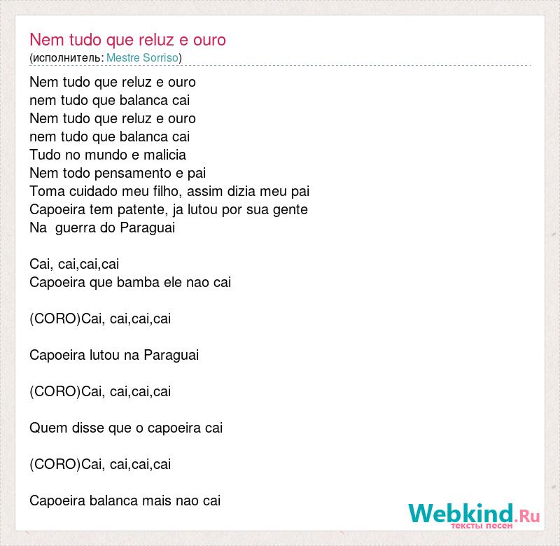 Nem tudo que reluz e ouro nem tudo que balanca cai Nem tudo que reluz e ouro nem tudo que balanca cai Tudo no mundo e malicia Nem todo pensamento e pai Toma cuidado meu filho, assim dizia meu pai Capoeira tem patente, ja lutou por sua gente Na guerra do Paraguai Cai, cai,cai,cai Capoeira que bamba ele nao cai (CORO)Cai, cai,cai,cai Capoeira lutou na Paraguai (CORO)Cai, cai,cai,cai Quem disse que o capoeira cai (CORO)Cai, cai,cai,cai Capoeira balanca mais nao cai