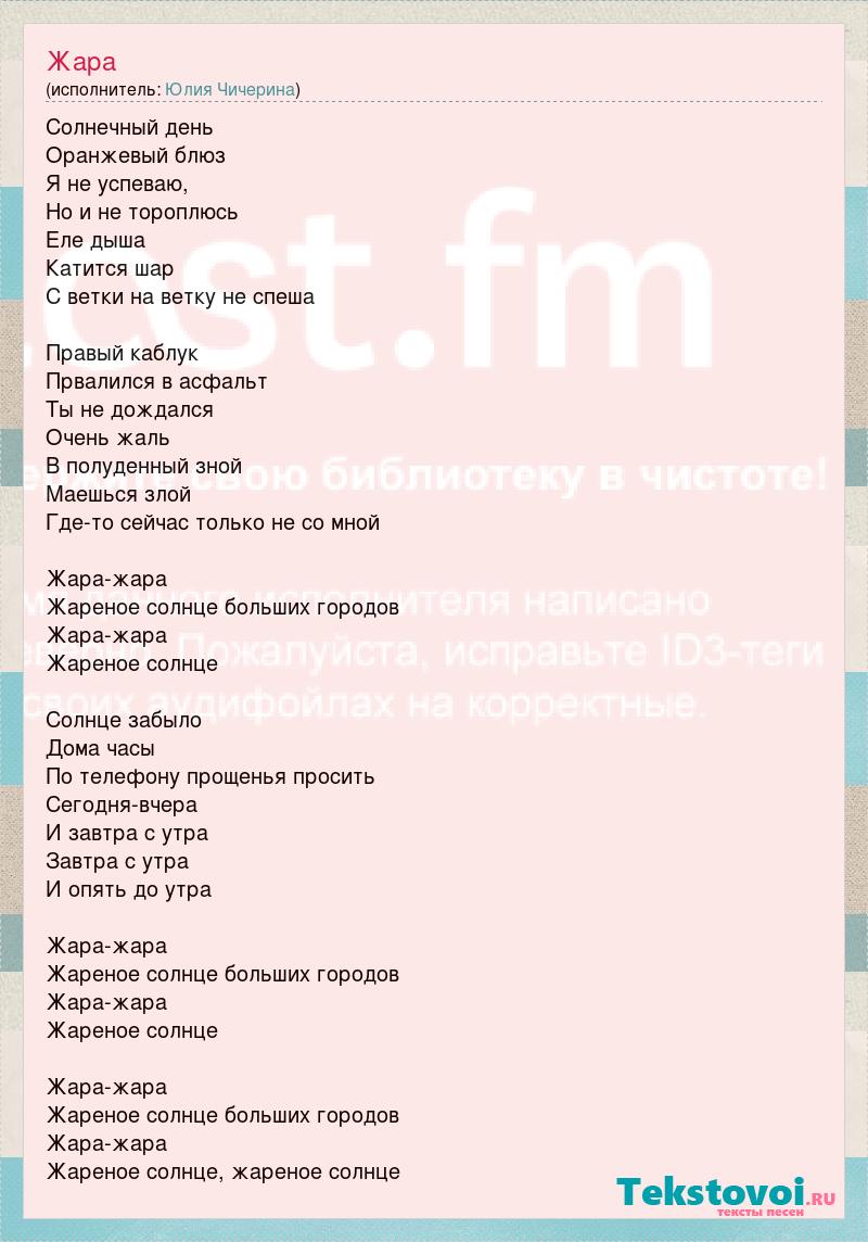Солнечный день Оранжевый блюз Я не успеваю, Но и не тороплюсь Еле дыша Катится шар С ветки на ветку не спеша Правый каблук Првалился в асфальт Ты не дождался Очень жаль В полуденный зной Маешься злой Где-то сейчас только не со мной Жара-жара Жареное солнце больших городов Жара-жара Жареное солнце Солнце забыло Дома часы По телефону прощенья просить Сегодня-вчера И завтра с утра Завтра с утра И опять до утра Жара-жара Жареное солнце больших городов Жара-жара Жареное солнце Жара-жара Жареное солнце больших городов Жара-жара Жареное солнце, жареное солнце