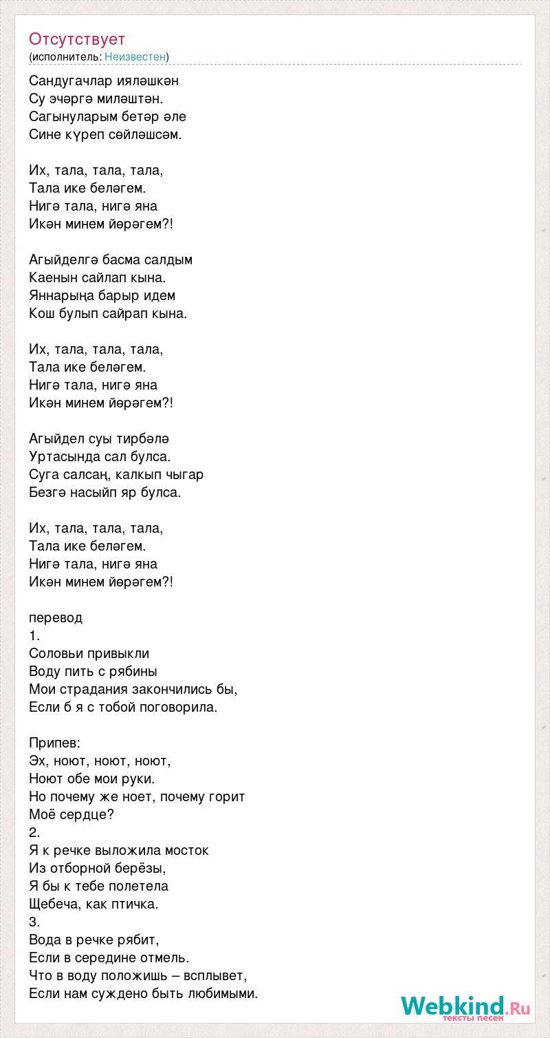 Сандугачлар ияләшкән Су эчәргә миләштән. Сагынуларым бетәр әле Сине күреп сөйләшсәм. Их, тала, тала, тала, Тала ике беләгем. Нигә тала, нигә яна Икән минем йөрәгем?! Агыйделгә басма салдым Каенын сайлап кына. Яннарыңа барыр идем Кош булып сайрап кына. Их, тала, тала, тала, Тала ике беләгем. Нигә тала, нигә яна Икән минем йөрәгем?! Агыйдел суы тирбәлә Уртасында сал булса. Суга салсаң, калкып чыгар Безгә насыйп яр булса. Их, тала, тала, тала, Тала ике беләгем. Нигә тала, нигә яна Икән минем йөрәгем?! перевод 1. Соловьи привыкли Воду пить с рябины Мои страдания закончились бы, Если б я с тобой поговорила. Припев: Эх, ноют, ноют, ноют, Ноют обе мои руки. Но почему же ноет, почему горит Моё сердце? 2. Я к речке выложила мосток Из отборной берёзы, Я бы к тебе полетела Щебеча, как птичка. 3. Вода в речке рябит, Если в середине отмель. Что в воду положишь – всплывет, Если нам суждено быть любимыми.