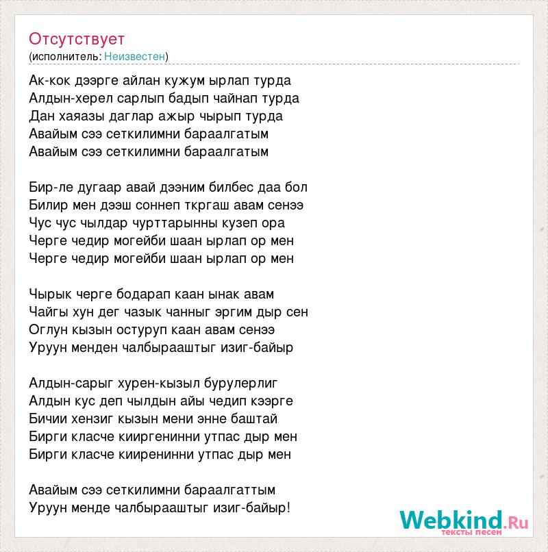 Ак-кок дээрге айлан кужум ырлап турда Алдын-херел сарлып бадып чайнап турда Дан хаяазы даглар ажыр чырып турда Авайым сээ сеткилимни бараалгатым Авайым сээ сеткилимни бараалгатым Бир-ле дугаар авай дээним билбес даа бол Билир мен дээш соннеп ткргаш авам сенээ Чус чус чылдар чурттарынны кузеп ора Черге чедир могейби шаан ырлап ор мен Черге чедир могейби шаан ырлап ор мен Чырык черге бодарап каан ынак авам Чайгы хун дег чазык чанныг эргим дыр сен Оглун кызын остуруп каан авам сенээ Уруун менден чалбырааштыг изиг-байыр Алдын-сарыг хурен-кызыл бурулерлиг Алдын кус деп чылдын айы чедип кээрге Бичии хензиг кызын мени энне баштай Бирги класче кииргенинни утпас дыр мен Бирги класче кииренинни утпас дыр мен Авайым сээ сеткилимни бараалгаттым Уруун менде чалбырааштыг изиг-байыр!