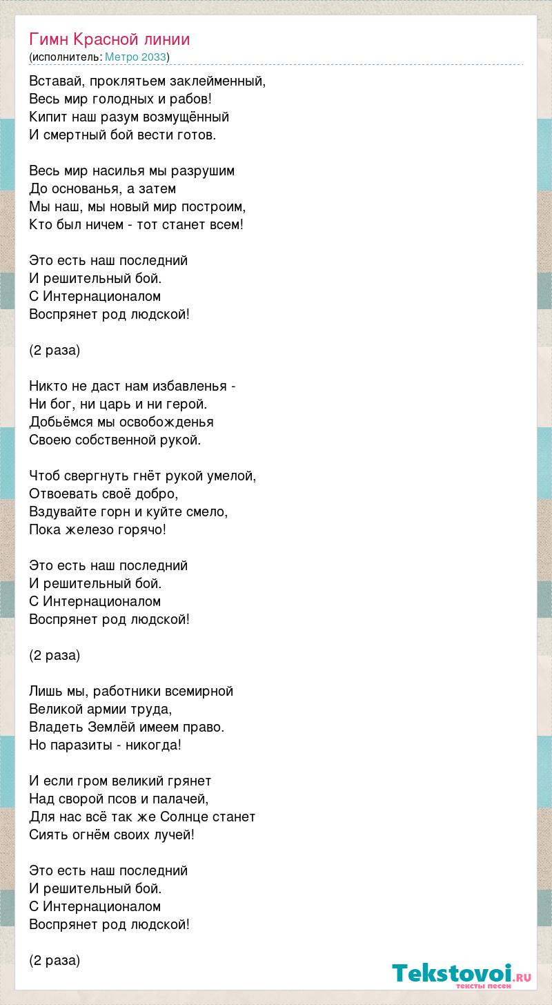 Вставай, проклятьем заклейменный, Весь мир голодных и рабов! Кипит наш разум возмущённый И смертный бой вести готов. Весь мир насилья мы разрушим До основанья, а затем Мы наш, мы новый мир построим, Кто был ничем - тот станет всем! Это есть наш последний И решительный бой. С Интернационалом Воспрянет род людской! (2 раза) Никто не даст нам избавленья - Ни бог, ни царь и ни герой. Добьёмся мы освобожденья Своею собственной рукой. Чтоб свергнуть гнёт рукой умелой, Отвоевать своё добро, Вздувайте горн и куйте смело, Пока железо горячо! Это есть наш последний И решительный бой. С Интернационалом Воспрянет род людской! (2 раза) Лишь мы, работники всемирной Великой армии труда, Владеть Землёй имеем право. Но паразиты - никогда! И если гром великий грянет Над сворой псов и палачей, Для нас всё так же Солнце станет Сиять огнём своих лучей! Это есть наш последний И решительный бой. С Интернационалом Воспрянет род людской! (2 раза)