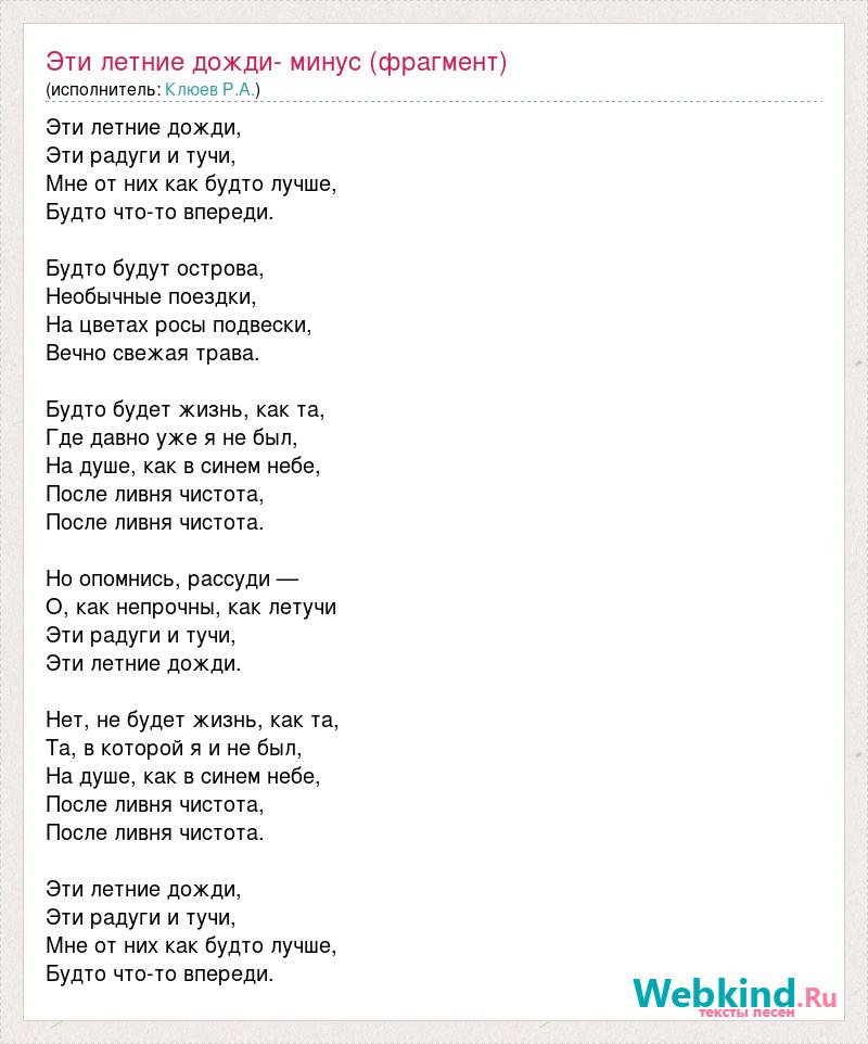 Эти летние дожди, Эти радуги и тучи, Мне от них как будто лучше, Будто что-то впереди. Будто будут острова, Необычные поездки, На цветах росы подвески, Вечно свежая трава. Будто будет жизнь, как та, Где давно уже я не был, На душе, как в синем небе, После ливня чистота, После ливня чистота. Но опомнись, рассуди — О, как непрочны, как летучи Эти радуги и тучи, Эти летние дожди. Нет, не будет жизнь, как та, Та, в которой я и не был, На душе, как в синем небе, После ливня чистота, После ливня чистота. Эти летние дожди, Эти радуги и тучи, Мне от них как будто лучше, Будто что-то впереди.