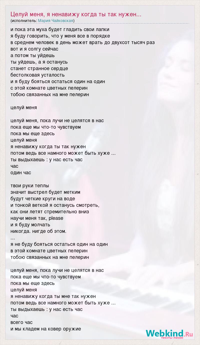 и пока эта муха будет гладить свои лапки я буду говорить, что у меня все в порядке в среднем человек в день может врать до двухсот тысяч раз вот и я солгу сейчас а потом ты уйдешь ты уйдешь, а я останусь станет странное сердце бестолковая усталость и я буду бояться остаться один на один с этой комнате цветных пелерин тобою связанных на мне пелерин целуй меня целуй меня, пока лучи не целятся в нас пока еще мы что-то чувствуем пока мы еще здесь целуй меня я ненавижу когда ты так нужен потом ведь все намного может быть хуже ... ты выдыхаешь : у нас есть час час один час твои руки теплы значит выстрел будет метким будут четкие круги на воде и тонкой веткой я останусь смотреть, как они летят стремительно вниз научи меня так, please и я буду молчать никогда. нигде об этом. ... я не буду бояться остаться один на один в этой комнате цветных пелерин тобою связанных на мне пелерин целуй меня, пока лучи не целятся в нас пока еще мы что-то чувствуем пока мы еще здесь целуй меня я ненавижу когда ты мне так нужен потом ведь все намного может быть хуже ... ты выдыхаешь : у нас есть час час всего час и мы кладем на ковер оружие