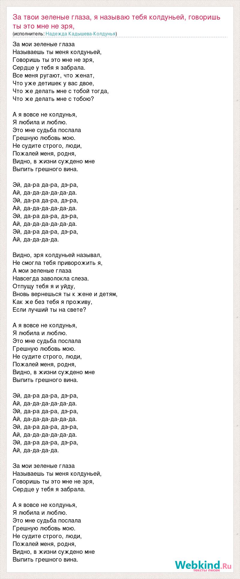 За мои зеленые глаза Называешь ты меня колдуньей, Говоришь ты это мне не зря, Сердце у тебя я забрала. Все меня ругают, что женат, Что уже детишек у вас двое, Что же делать мне с тобой тогда, Что же делать мне с тобою? А я вовсе не колдунья, Я любила и люблю. Это мне судьба послала Грешную любовь мою. Не судите строго, люди, Пожалей меня, родня, Видно, в жизни суждено мне Выпить грешного вина. Эй, да-ра да-ра, дэ-ра, Ай, да-да-да-да-да-да. Эй, да-ра да-ра, дэ-ра, Ай, да-да-да-да-да-да. Эй, да-ра да-ра, дэ-ра, Ай, да-да-да-да-да-да. Эй, да-ра да-ра, дэ-ра, Ай, да-да-да-да. Видно, зря колдуньей называл, Не смогла тебя приворожить я, А мои зеленые глаза Навсегда заволокла слеза. Отпущу тебя я и уйду, Вновь вернешься ты к жене и детям, Как же без тебя я проживу, Если лучший ты на свете? А я вовсе не колдунья, Я любила и люблю. Это мне судьба послала Грешную любовь мою. Не судите строго, люди, Пожалей меня, родня, Видно, в жизни суждено мне Выпить грешного вина. Эй, да-ра да-ра, дэ-ра, Ай, да-да-да-да-да-да. Эй, да-ра да-ра, дэ-ра, Ай, да-да-да-да-да-да. Эй, да-ра да-ра, дэ-ра, Ай, да-да-да-да-да-да. Эй, да-ра да-ра, дэ-ра, Ай, да-да-да-да. За мои зеленые глаза Называешь ты меня колдуньей, Говоришь ты это мне не зря, Сердце у тебя я забрала. А я вовсе не колдунья, Я любила и люблю. Это мне судьба послала Грешную любовь мою. Не судите строго, люди, Пожалей меня, родня, Видно, в жизни суждено мне Выпить грешного вина.