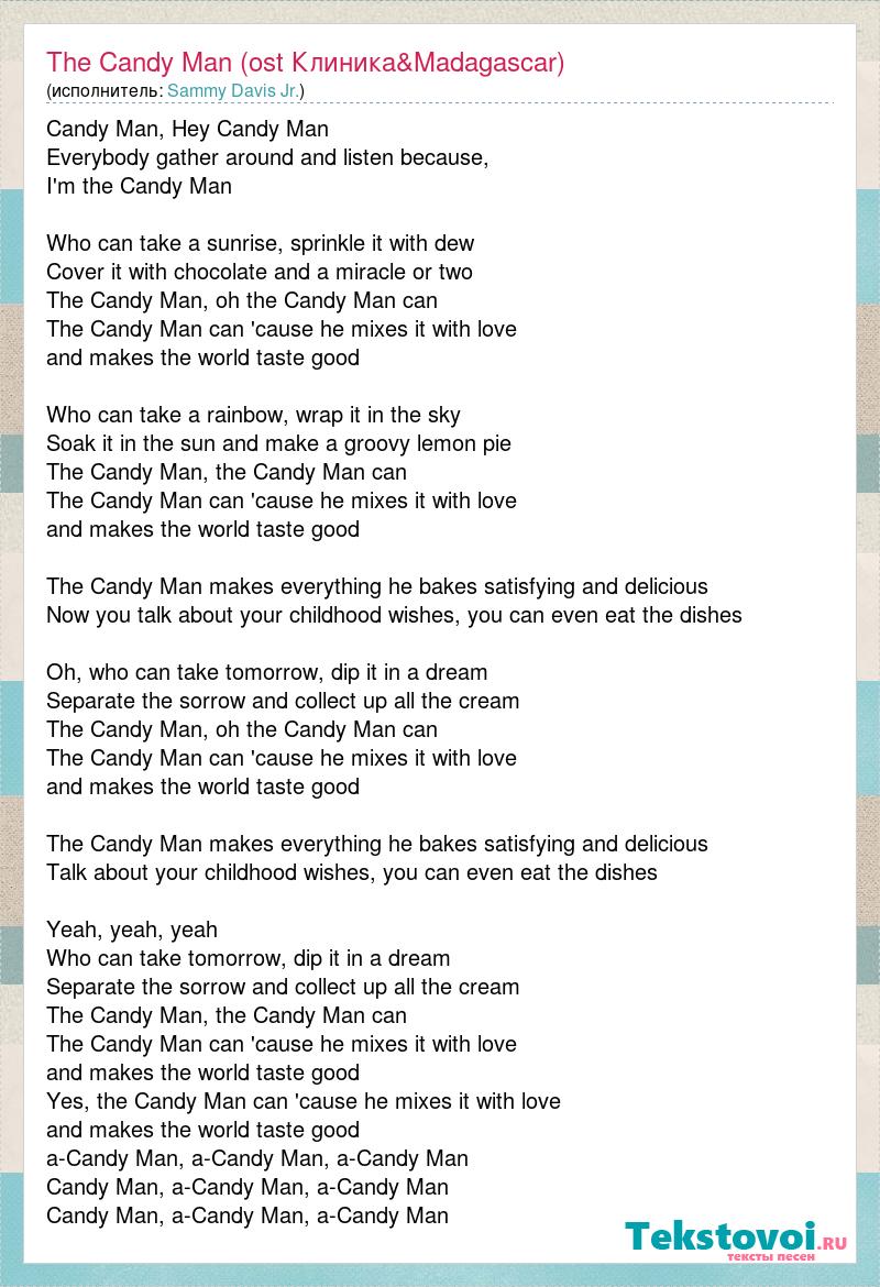Candy Man, Hey Candy Man Everybody gather around and listen because, I'm the Candy Man Who can take a sunrise, sprinkle it with dew Cover it with chocolate and a miracle or two The Candy Man, oh the Candy Man can The Candy Man can 'cause he mixes it with love and makes the world taste good Who can take a rainbow, wrap it in the sky Soak it in the sun and make a groovy lemon pie The Candy Man, the Candy Man can The Candy Man can 'cause he mixes it with love and makes the world taste good The Candy Man makes everything he bakes satisfying and delicious Now you talk about your childhood wishes, you can even eat the dishes Oh, who can take tomorrow, dip it in a dream Separate the sorrow and collect up all the cream The Candy Man, oh the Candy Man can The Candy Man can 'cause he mixes it with love and makes the world taste good The Candy Man makes everything he bakes satisfying and delicious Talk about your childhood wishes, you can even eat the dishes Yeah, yeah, yeah Who can take tomorrow, dip it in a dream Separate the sorrow and collect up all the cream The Candy Man, the Candy Man can The Candy Man can 'cause he mixes it with love and makes the world taste good Yes, the Candy Man can 'cause he mixes it with love and makes the world taste good a-Candy Man, a-Candy Man, a-Candy Man Candy Man, a-Candy Man, a-Candy Man Candy Man, a-Candy Man, a-Candy Man