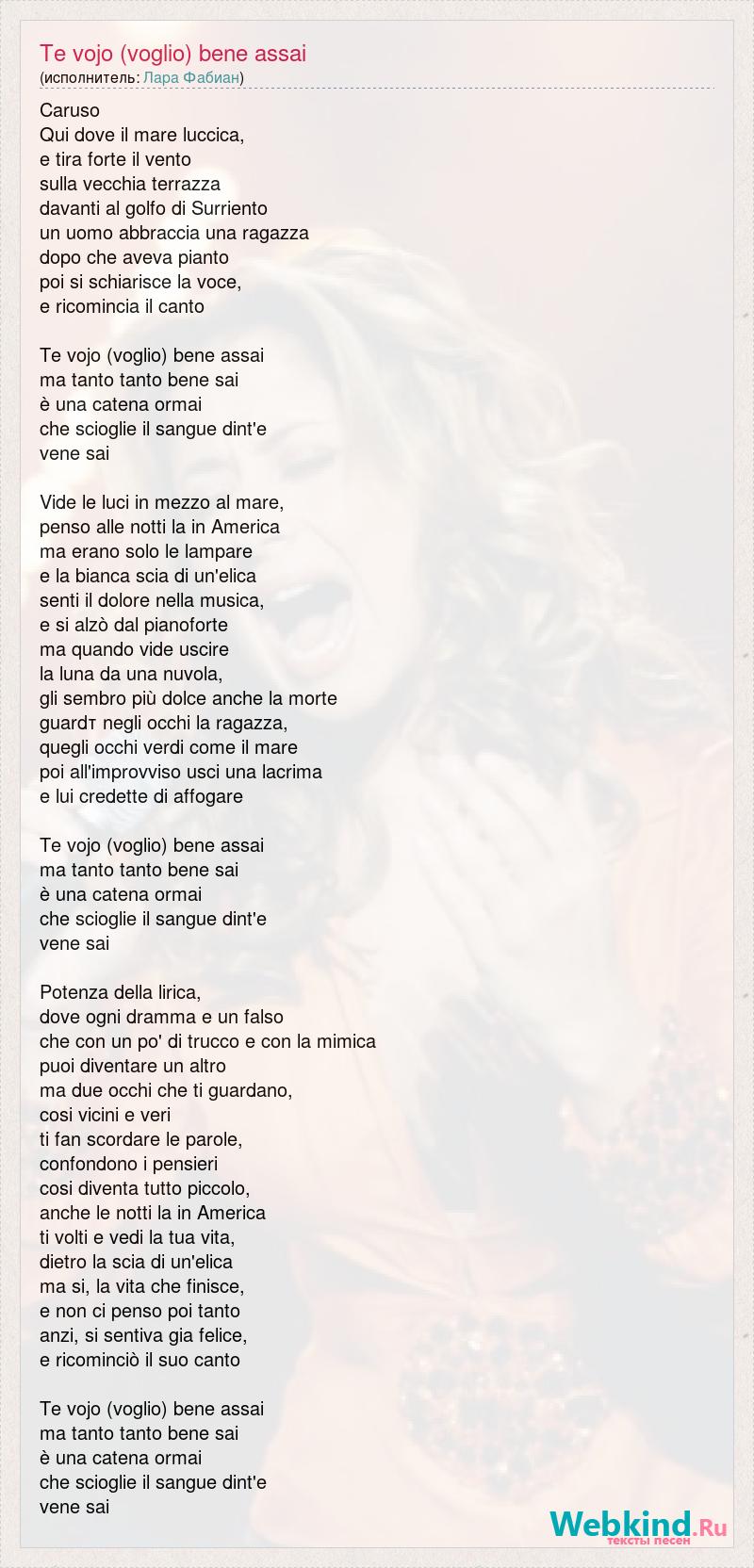 Caruso Qui dove il mare luccica, e tira forte il vento sulla vecchia terrazza davanti al golfo di Surriento un uomo abbraccia una ragazza dopo che aveva pianto poi si schiarisce la voce, e ricomincia il canto Te vojo (voglio) bene assai ma tanto tanto bene sai è una catena ormai che scioglie il sangue dint'e vene sai Vide le luci in mezzo al mare, penso alle notti lа in America ma erano solo le lampare e la bianca scia di un'elica senti il dolore nella musica, e si alzò dal pianoforte ma quando vide uscire la luna da una nuvola, gli sembro più dolce anche la morte guardт negli occhi la ragazza, quegli occhi verdi come il mare poi all'improvviso usci una lacrima e lui credette di affogare Te vojo (voglio) bene assai ma tanto tanto bene sai è una catena ormai che scioglie il sangue dint'e vene sai Potenza della lirica, dove ogni dramma e un falso che con un po' di trucco e con la mimica puoi diventare un altro ma due occhi che ti guardano, cosi vicini e veri ti fan scordare le parole, confondono i pensieri cosi diventa tutto piccolo, anche le notti lа in America ti volti e vedi la tua vita, dietro la scia di un'elica ma si, la vita che finisce, e non ci penso poi tanto anzi, si sentiva giа felice, e ricominciò il suo canto Te vojo (voglio) bene assai ma tanto tanto bene sai è una catena ormai che scioglie il sangue dint'e vene sai