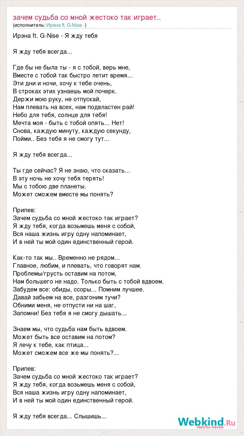 Ирэна ft. G-Nise - Я жду тебя Я жду тебя всегда... Где бы не была ты - я с тобой, верь мне, Вместе с тобой так быстро летит время... Эти дни и ночи, хочу к тебе очень, В строках этих узнаешь мой почерк. Держи мою руку, не отпускай, Нам плевать на всех, нам подвластен рай! Небо для тебя, солнце для тебя! Мечта моя - быть с тобой опять... Нет! Снова, каждую минуту, каждую секунду, Пойми.. Без тебя я не смогу тут... Я жду тебя всегда... Ты где сейчас? Я не знаю, что сказать... В эту ночь не хочу тебя терять! Мы с тобою две планеты. Может сможем вместе мы понять? Припев: Зачем судьба со мной жестоко так играет? Я жду тебя, когда возьмешь меня с собой, Вся наша жизнь игру одну напоминает, И в ней ты мой один единственный герой. Как-то так мы.. Временно не рядом... Главное, любим, и плевать, что говорят нам. Проблемы/грусть оставим на потом, Нам большего не надо. Только быть с тобой вдвоем. Забудем все: обиды, ссоры... Помним лучшее. Давай забьем на все, разгоним тучи? Обними меня, не отпусти ни на шаг, Запомни! Без тебя я не смогу дышать... Знаем мы, что судьба нам быть вдвоем. Может быть все оставим на потом? Я лечу к тебе, как птица... Может сможем все же мы понять?... Припев: Зачем судьба со мной жестоко так играет? Я жду тебя, когда возьмешь меня с собой, Вся наша жизнь игру одну напоминает, И в ней ты мой один единственный герой. Я жду тебя всегда... Слышишь...