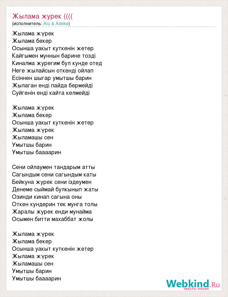 Жылама жүрек Жылама бекер Осынша уакыт куткенін жетер Кайгымен муннын барине тозді Киналма журегим бул кунде отед Неге жылайсын откенді ойлап Есіннен шыгар умытшы барин Жылаган енді пайда бермейді Суйгенін енді кайта келмейді Жылама жүрек Жылама бекер Осынша уакыт куткенін жетер Жылама жүрек Жыламашы сен Умытшы барин Умытшы баааарин Сени ойлаумен тандарым атты Сагындым сени сагындым каты Бейкуна журек сени іздеумен Денеме сыймай булкынып жаты Озинди кинап сагына оны Откен кундерин тек мунга толы Жаралы журек енди мунайма Осымен битти махаббат жолы Жылама жүрек Жылама бекер Осынша уакыт куткенін жетер Жылама жүрек Жыламашы сен Умытшы барин Умытшы баааарин