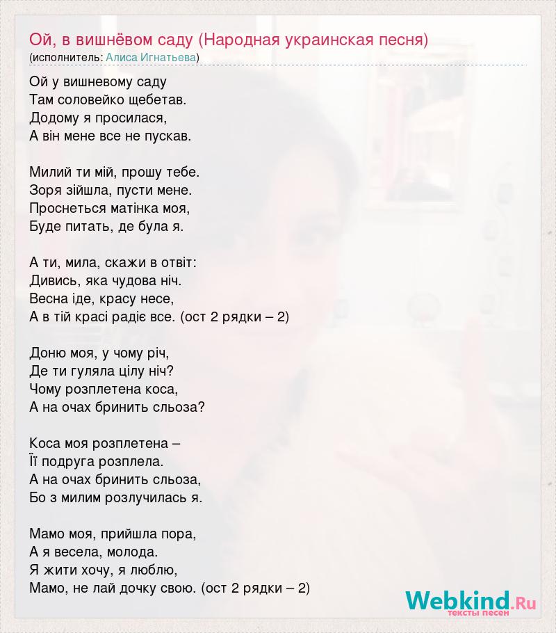 Ой у вишневому саду Там соловейко щебетав. Додому я просилася, А він мене все не пускав. Милий ти мій, прошу тебе. Зоря зійшла, пусти мене. Проснеться матінка моя, Буде питать, де була я. А ти, мила, скажи в отвіт: Дивись, яка чудова ніч. Весна іде, красу несе, А в тій красі радіє все. (ост 2 рядки – 2) Доню моя, у чому річ, Де ти гуляла цілу ніч? Чому розплетена коса, А на очах бринить сльоза? Коса моя розплетена – Її подруга розплела. А на очах бринить сльоза, Бо з милим розлучилась я. Мамо моя, прийшла пора, А я весела, молода. Я жити хочу, я люблю, Мамо, не лай дочку свою. (ост 2 рядки – 2)