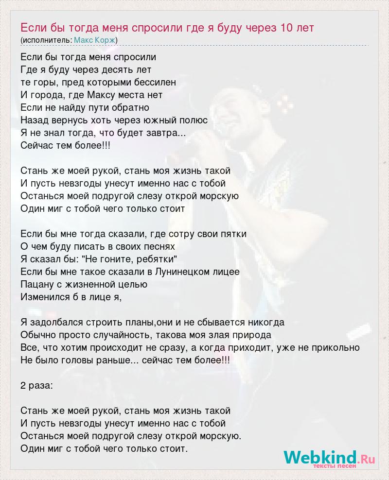 Если бы тогда меня спросили Где я буду через десять лет те горы, пред которыми бессилен И города, где Максу места нет Если не найду пути обратно Назад вернусь хоть через южный полюс Я не знал тогда, что будет завтра... Сейчас тем более!!! Стань же моей рукой, стань моя жизнь такой И пусть невзгоды унесут именно нас с тобой Останься моей подругой слезу открой морскую Один миг с тобой чего только стоит Если бы мне тогда сказали, где сотру свои пятки О чем буду писать в своих песнях Я сказал бы: "Не гоните, ребятки" Если бы мне такое сказали в Лунинецком лицее Пацану с жизненной целью Изменился б в лице я, Я задолбался строить планы,они и не сбывается никогда Обычно просто случайность, такова моя злая природа Все, что хотим происходит не сразу, а когда приходит, уже не прикольно Не было головы раньше... сейчас тем более!!! 2 раза: Стань же моей рукой, стань моя жизнь такой И пусть невзгоды унесут именно нас с тобой Останься моей подругой слезу открой морскую. Один миг с тобой чего только стоит.