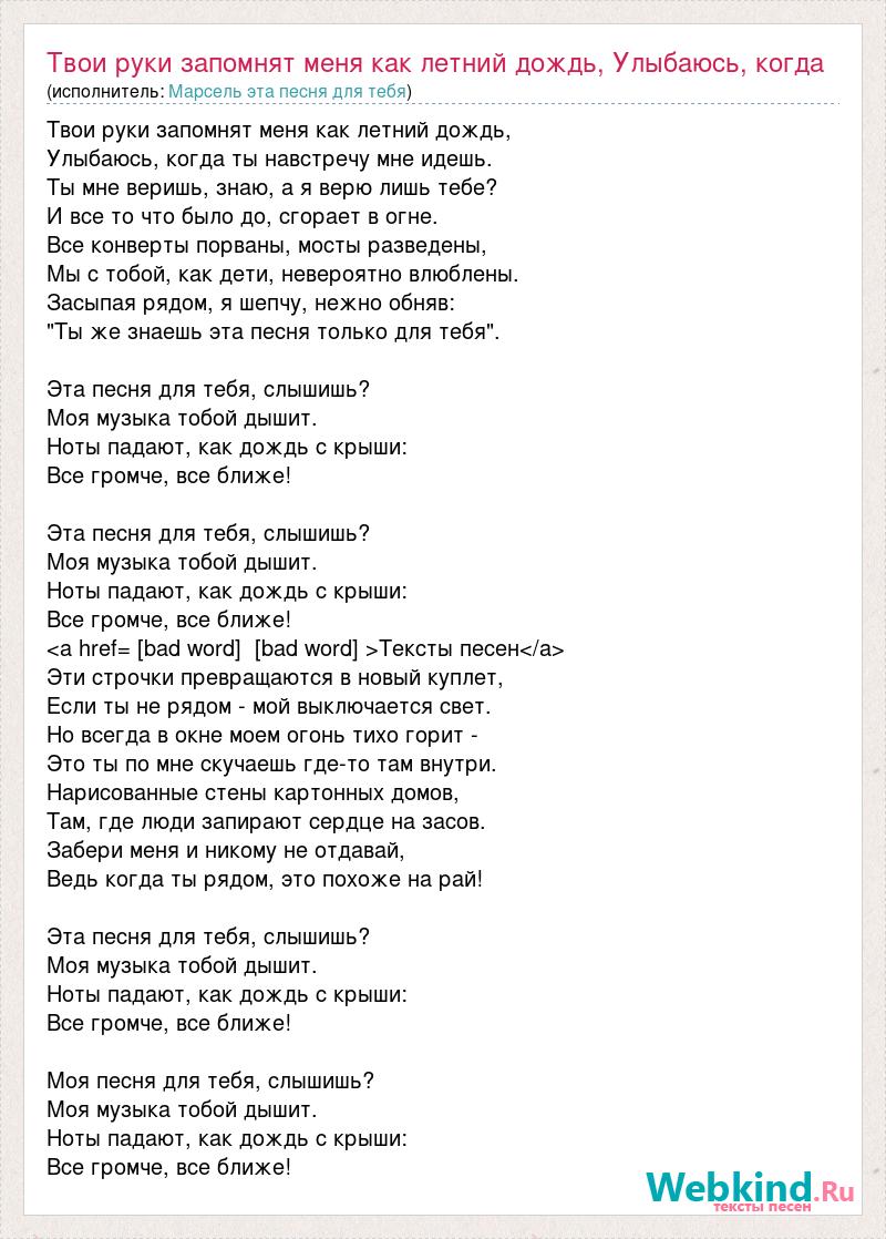 Твои руки запомнят меня как летний дождь, Улыбаюсь, когда ты навстречу мне идешь. Ты мне веришь, знаю, а я верю лишь тебе? И все то что было до, сгорает в огне. Все конверты порваны, мосты разведены, Мы с тобой, как дети, невероятно влюблены. Засыпая рядом, я шепчу, нежно обняв: "Ты же знаешь эта песня только для тебя". Эта песня для тебя, слышишь? Моя музыка тобой дышит. Ноты падают, как дождь с крыши: Все громче, все ближе! Эта песня для тебя, слышишь? Моя музыка тобой дышит. Ноты падают, как дождь с крыши: Все громче, все ближе! <a href= [bad word] [bad word] >Тексты песен</a> Эти строчки превращаются в новый куплет, Если ты не рядом - мой выключается свет. Но всегда в окне моем огонь тихо горит - Это ты по мне скучаешь где-то там внутри. Нарисованные стены картонных домов, Там, где люди запирают сердце на засов. Забери меня и никому не отдавай, Ведь когда ты рядом, это похоже на рай! Эта песня для тебя, слышишь? Моя музыка тобой дышит. Ноты падают, как дождь с крыши: Все громче, все ближе! Моя песня для тебя, слышишь? Моя музыка тобой дышит. Ноты падают, как дождь с крыши: Все громче, все ближе!