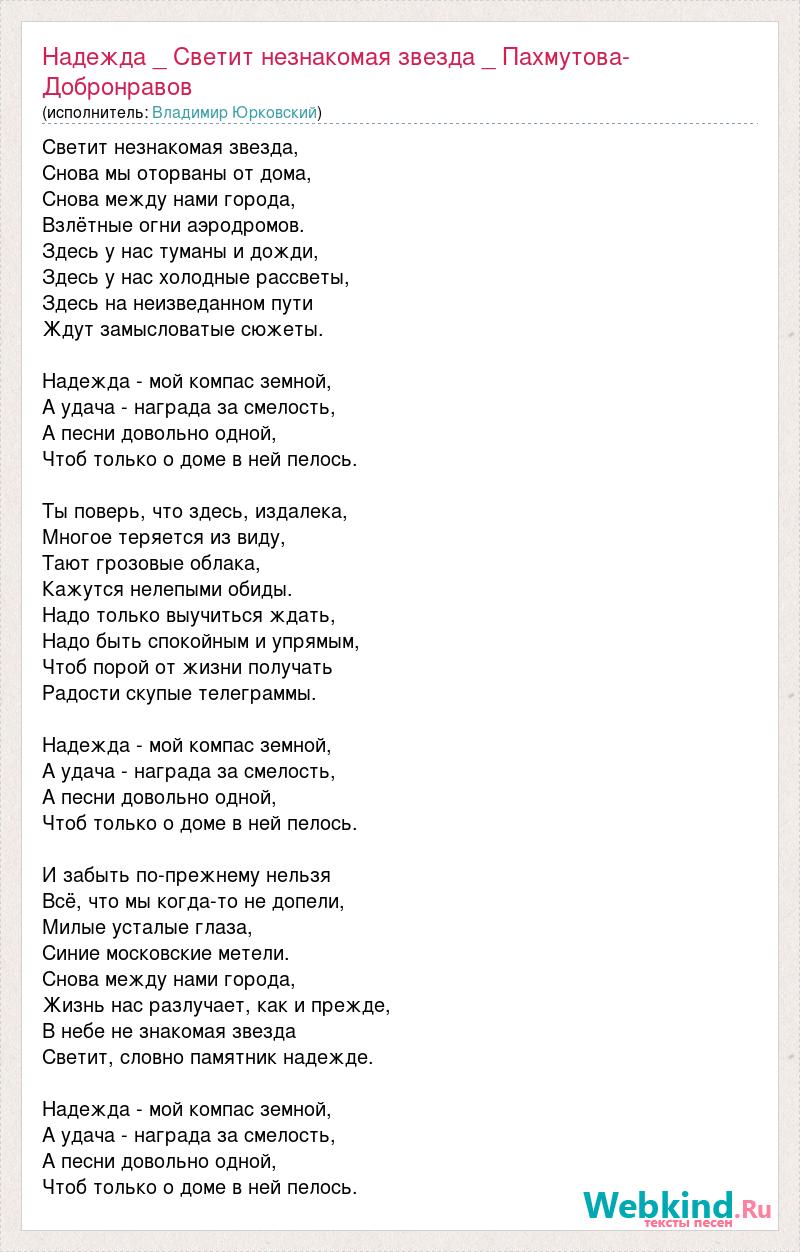 Светит незнакомая звезда, Снова мы оторваны от дома, Снова между нами города, Взлётные огни аэродромов. Здесь у нас туманы и дожди, Здесь у нас холодные рассветы, Здесь на неизведанном пути Ждут замысловатые сюжеты. Надежда - мой компас земной, А удача - награда за смелость, А песни довольно одной, Чтоб только о доме в ней пелось. Ты поверь, что здесь, издалека, Многое теряется из виду, Тают грозовые облака, Кажутся нелепыми обиды. Надо только выучиться ждать, Надо быть спокойным и упрямым, Чтоб порой от жизни получать Радости скупые телеграммы. Надежда - мой компас земной, А удача - награда за смелость, А песни довольно одной, Чтоб только о доме в ней пелось. И забыть по-прежнему нельзя Всё, что мы когда-то не допели, Милые усталые глаза, Синие московские метели. Снова между нами города, Жизнь нас разлучает, как и прежде, В небе не знакомая звезда Светит, словно памятник надежде. Надежда - мой компас земной, А удача - награда за смелость, А песни довольно одной, Чтоб только о доме в ней пелось.