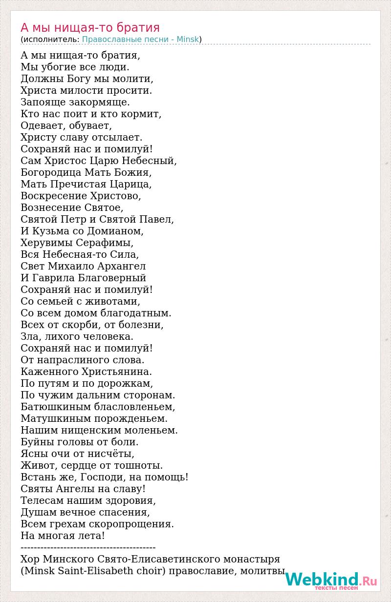 А мы нищая-то братия, Мы убогие все люди. Должны Богу мы молити, Христа милости просити. Запояще закормяще. Кто нас поит и кто кормит, Одевает, обувает, Христу славу отсылает. Сохраняй нас и помилуй! Сам Христос Царю Небесный, Богородица Мать Божия, Мать Пречистая Царица, Воскресение Христово, Вознесение Святое, Святой Петр и Святой Павел, И Кузьма со Домианом, Херувимы Серафимы, Вся Небесная-то Сила, Свет Михаило Архангел И Гаврила Благоверный Сохраняй нас и помилуй! Со семьей с животами, Со всем домом благодатным. Всех от скорби, от болезни, Зла, лихого человека. Сохраняй нас и помилуй! От напраслиного слова. Каженного Христьянина. По путям и по дорожкам, По чужим дальним сторонам. Батюшкиным бласловленьем, Матушкиным порожденьем. Нашим нищенским моленьем. Буйны головы от боли. Ясны очи от нисчёты, Живот, сердце от тошноты. Встань же, Господи, на помощь! Святы Ангелы на славу! Телесам нашим здоровия, Душам вечное спасения, Всем грехам скоропрощения. На многая лета! ----------------------------------------- Хор Минского Свято-Елисаветинского монастыря (Minsk Saint-Elisabeth choir) православие, молитвы