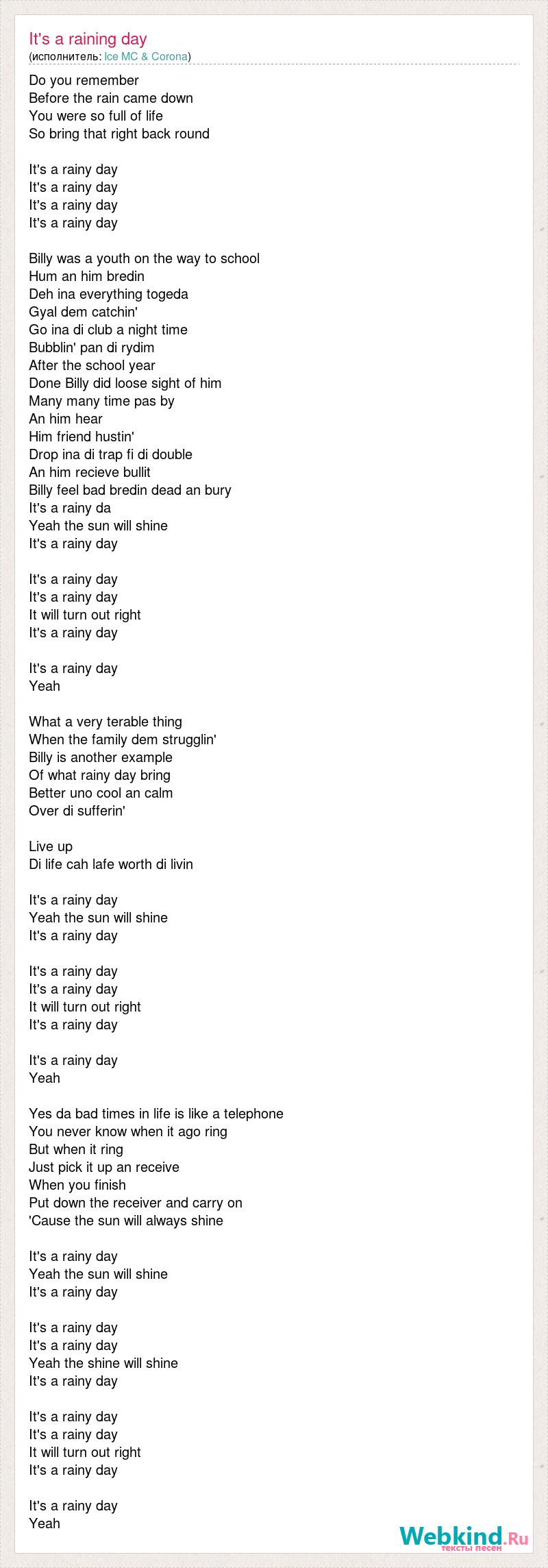 Do you remember Before the rain came down You were so full of life So bring that right back round It's a rainy day It's a rainy day It's a rainy day It's a rainy day Billy was a youth on the way to school Hum an him bredin Deh ina everything togeda Gyal dem catchin' Go ina di club a night time Bubblin' pan di rydim After the school year Done Billy did loose sight of him Many many time pas by An him hear Him friend hustin' Drop ina di trap fi di double An him recieve bullit Billy feel bad bredin dead an bury It's a rainy da Yeah the sun will shine It's a rainy day It's a rainy day It's a rainy day It will turn out right It's a rainy day It's a rainy day Yeah What a very terable thing When the family dem strugglin' Billy is another example Of what rainy day bring Better uno cool an calm Over di sufferin' Live up Di life cah lafe worth di livin It's a rainy day Yeah the sun will shine It's a rainy day It's a rainy day It's a rainy day It will turn out right It's a rainy day It's a rainy day Yeah Yes da bad times in life is like a telephone You never know when it ago ring But when it ring Just pick it up an receive When you finish Put down the receiver and carry on 'Cause the sun will always shine It's a rainy day Yeah the sun will shine It's a rainy day It's a rainy day It's a rainy day Yeah the shine will shine It's a rainy day It's a rainy day It's a rainy day It will turn out right It's a rainy day It's a rainy day Yeah