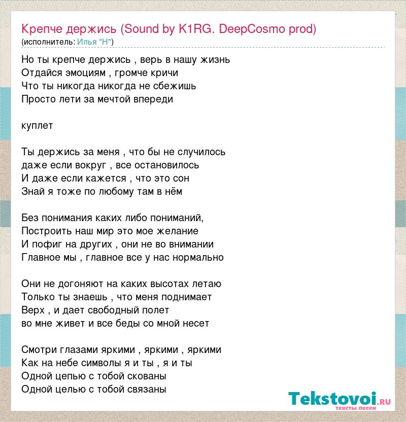 Но ты крепче держись , верь в нашу жизнь Отдайся эмоциям , громче кричи Что ты никогда никогда не сбежишь Просто лети за мечтой впереди куплет Ты держись за меня , что бы не случилось даже если вокруг , все остановилось И даже если кажется , что это сон Знай я тоже по любому там в нём Без понимания каких либо пониманий, Построить наш мир это мое желание И пофиг на других , они не во внимании Главное мы , главное все у нас нормально Они не догоняют на каких высотах летаю Только ты знаешь , что меня поднимает Верх , и дает свободный полет во мне живет и все беды со мной несет Смотри глазами яркими , яркими , яркими Как на небе символы я и ты , я и ты Одной цепью с тобой скованы Одной целью с тобой связаны