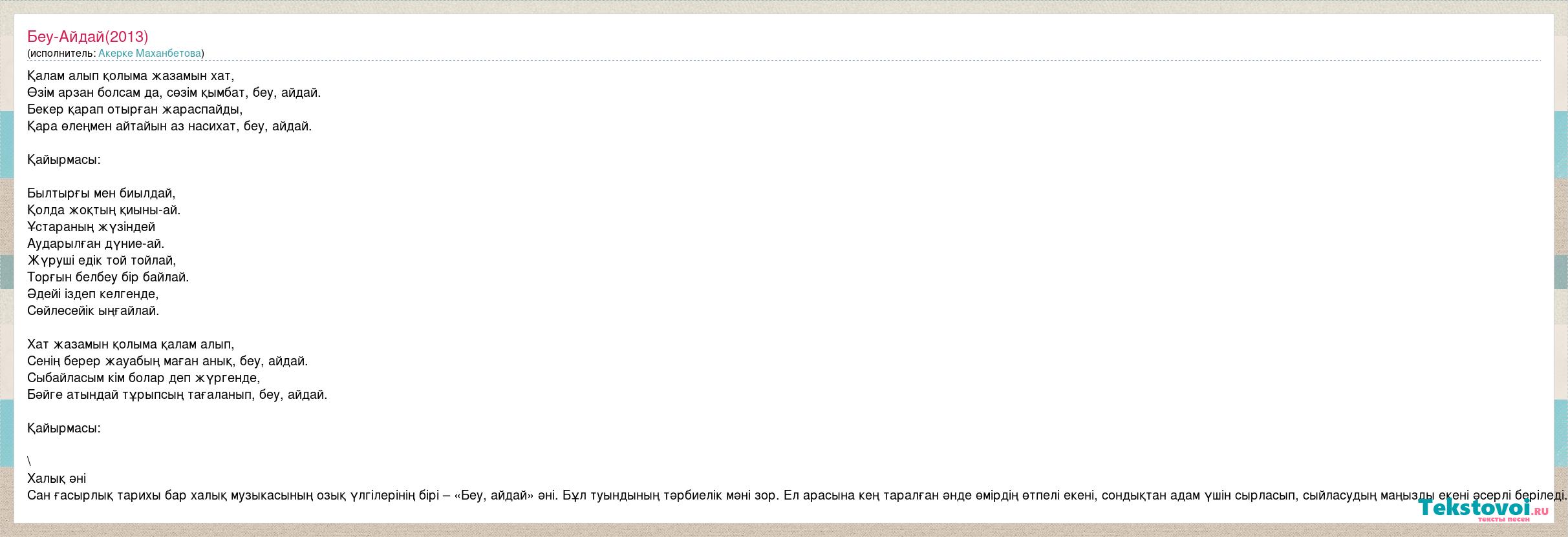 Қалам алып қолыма жазамын хат, Өзім арзан болсам да, сөзім қымбат, беу, айдай. Бекер қарап отырған жараспайды, Қара өлеңмен айтайын аз насихат, беу, айдай. Қайырмасы: Былтырғы мен биылдай, Қолда жоқтың қиыны-ай. Ұстараның жүзіндей Аударылған дүние-ай. Жүруші едік той тойлай, Торғын белбеу бір байлай. Әдейі іздеп келгенде, Сөйлесейік ыңғайлай. Хат жазамын қолыма қалам алып, Сенің берер жауабың маған анық, беу, айдай. Сыбайласым кім болар деп жүргенде, Бәйге атындай тұрыпсың тағаланып, беу, айдай. Қайырмасы: \ Халық әні Сан ғасырлық тарихы бар халық музыкасының озық үлгілерінің бірі – «Беу, айдай» әні. Бұл туындының тәрбиелік мәні зор. Ел арасына кең таралған әнде өмірдің өтпелі екені, сондықтан адам үшін сырласып, сыйласудың маңызды екені әсерлі беріледі.