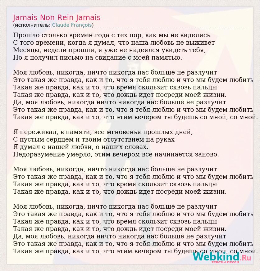 Прошло столько времен года с тех пор, как мы не виделись С того времени, когда я думал, что наша любовь не выживет Месяцы, недели прошли, я уже не надеялся увидеть тебя, Но я получил письмо на свидание с моей памятью. Моя любовь, никогда, ничто никогда нас больше не разлучит Это такая же правда, как и то, что я тебя люблю и что мы будем любить Такая же правда, как и то, что время скользит сквозь пальцы Такая же правда, как и то, что дождь идет посреди моей жизни. Да, моя любовь, никогда ничто никогда нас больше не разлучит Это такая же правда, как и то, что я тебя люблю и что мы будем любить Такая же правда, как и то, что этим вечером ты будешь со мной, со мной. Я переживал, в памяти, все мгновенья прошлых дней, С пустым сердцем и твоим отсутствием на руках Я думал о нашей любви, о наших словах. Недоразумение умерло, этим вечером все начинается заново. Моя любовь, никогда, ничто никогда нас больше не разлучит Это такая же правда, как и то, что я тебя люблю и что мы будем любить Такая же правда, как и то, что время скользит сквозь пальцы Такая же правда, как и то, что дождь идет посреди моей жизни. Моя любовь, никогда, ничто никогда нас больше не разлучит Это такая же правда, как и то, что я тебя люблю и что мы будем любить Такая же правда, как и то, что время скользит сквозь пальцы Такая же правда, как и то, что дождь идет посреди моей жизни. Да, моя любовь, никогда ничто никогда нас больше не разлучит Это такая же правда, как и то, что я тебя люблю и что мы будем любить Такая же правда, как и то, что этим вечером ты будешь со мной, со мной.