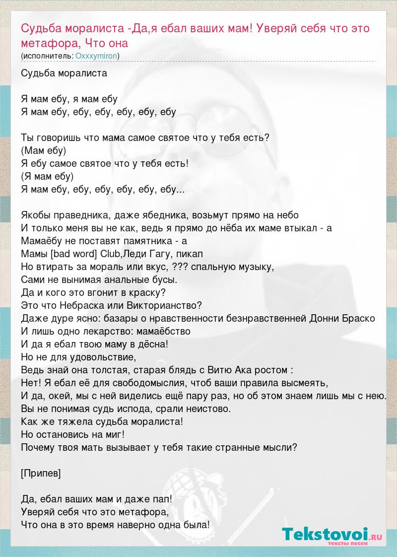 Судьба моралиста Я мам ебу, я мам ебу Я мам ебу, ебу, ебу, ебу, ебу, ебу Ты говоришь что мама самое святое что у тебя есть? (Мам ебу) Я ебу самое святое что у тебя есть! (Я мам ебу) Я мам ебу, ебу, ебу, ебу, ебу, ебу... Якобы праведника, даже ябедника, возьмут прямо на небо И только меня вы не как, ведь я прямо до нёба их маме втыкал - а Мамаёбу не поставят памятника - а Мамы [bad word] Club,Леди Гагу, пикап Но втирать за мораль или вкус, ??? спальную музыку, Сами не вынимая анальные бусы. Да и кого это вгонит в краску? Это что Небраска или Викторианство? Даже дуре ясно: базары о нравственности безнравственней Донни Браско И лишь одно лекарство: мамаёбство И да я ебал твою маму в дёсна! Но не для удовольствие, Ведь знай она толстая, старая блядь с Витю Ака ростом : Нет! Я ебал её для свободомыслия, чтоб ваши правила высмеять, И да, окей, мы с ней виделись ещё пару раз, но об этом знаем лишь мы с нею. Вы не понимая судь испода, срали неистово. Как же тяжела судьба моралиста! Но остановись на миг! Почему твоя мать вызывает у тебя такие странные мысли? [Припев] Да, ебал ваших мам и даже пап! Уверяй себя что это метафора, Что она в это время наверно одна была!