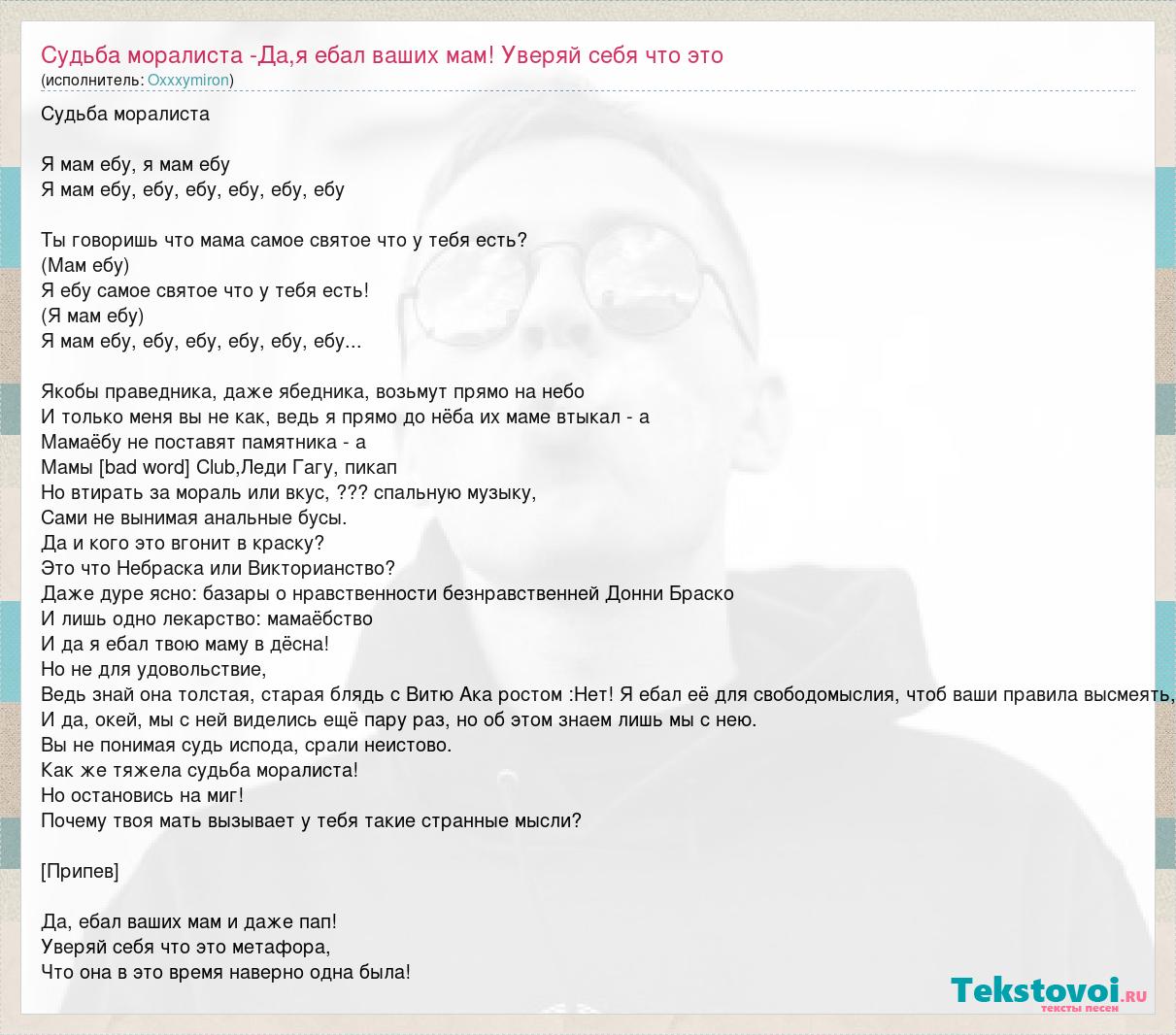 Судьба моралиста Я мам ебу, я мам ебу Я мам ебу, ебу, ебу, ебу, ебу, ебу Ты говоришь что мама самое святое что у тебя есть? (Мам ебу) Я ебу самое святое что у тебя есть! (Я мам ебу) Я мам ебу, ебу, ебу, ебу, ебу, ебу... Якобы праведника, даже ябедника, возьмут прямо на небо И только меня вы не как, ведь я прямо до нёба их маме втыкал - а Мамаёбу не поставят памятника - а Мамы любят Comedy Club,Леди Гагу, пикап Но втирать за мораль или вкус, ??? спальную музыку, Сами не вынимая анальные бусы. Да и кого это вгонит в краску? Это что Небраска или Викторианство? Даже дуре ясно: базары о нравственности безнравственней Донни Браско И лишь одно лекарство: мамаёбство И да я ебал твою маму в дёсна! Но не для удовольствие, Ведь знай она толстая, старая блядь с Витю Ака ростом :Нет! Я ебал её для свободомыслия, чтоб ваши правила высмеять, И да, окей, мы с ней виделись ещё пару раз, но об этом знаем лишь мы с нею. Вы не понимая судь испода, срали неистово. Как же тяжела судьба моралиста! Но остановись на миг! Почему твоя мать вызывает у тебя такие странные мысли? [Припев] Да, ебал ваших мам и даже пап! Уверяй себя что это метафора, Что она в это время наверно одна была!