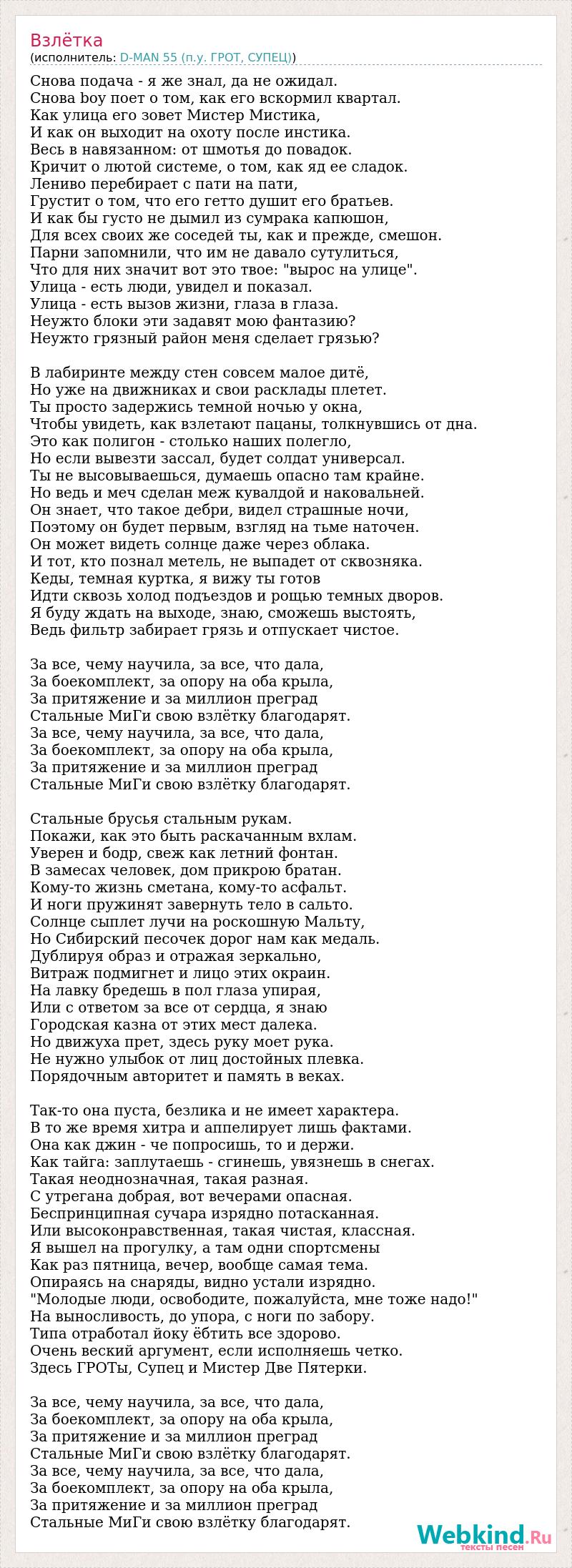 Снова подача - я же знал, да не ожидал. Снова boy поет о том, как его вскормил квартал. Как улица его зовет Мистер Мистика, И как он выходит на охоту после инстика. Весь в навязанном: от шмотья до повадок. Кричит о лютой системе, о том, как яд ее сладок. Лениво перебирает с пати на пати, Грустит о том, что его гетто душит его братьев. И как бы густо не дымил из сумрака капюшон, Для всех своих же соседей ты, как и прежде, смешон. Парни запомнили, что им не давало сутулиться, Что для них значит вот это твое: "вырос на улице". Улица - есть люди, увидел и показал. Улица - есть вызов жизни, глаза в глаза. Неужто блоки эти задавят мою фантазию? Неужто грязный район меня сделает грязью? В лабиринте между стен совсем малое дитё, Но уже на движниках и свои расклады плетет. Ты просто задержись темной ночью у окна, Чтобы увидеть, как взлетают пацаны, толкнувшись от дна. Это как полигон - столько наших полегло, Но если вывезти зассал, будет солдат универсал. Ты не высовываешься, думаешь опасно там крайне. Но ведь и меч сделан меж кувалдой и наковальней. Он знает, что такое дебри, видел страшные ночи, Поэтому он будет первым, взгляд на тьме наточен. Он может видеть солнце даже через облака. И тот, кто познал метель, не выпадет от сквозняка. Кеды, темная куртка, я вижу ты готов Идти сквозь холод подъездов и рощью темных дворов. Я буду ждать на выходе, знаю, сможешь выстоять, Ведь фильтр забирает грязь и отпускает чистое. За все, чему научила, за все, что дала, За боекомплект, за опору на оба крыла, За притяжение и за миллион преград Стальные МиГи свою взлётку благодарят. За все, чему научила, за все, что дала, За боекомплект, за опору на оба крыла, За притяжение и за миллион преград Стальные МиГи свою взлётку благодарят. Стальные брусья стальным рукам. Покажи, как это быть раскачанным вхлам. Уверен и бодр, свеж как летний фонтан. В замесах человек, дом прикрою братан. Кому-то жизнь сметана, кому-то асфальт. И ноги пружинят завернуть тело в сальто. Солнце сыплет лучи на роскошную Мальту, Но Сибирский песочек дорог нам как медаль. Дублируя образ и отражая зеркально, Витраж подмигнет и лицо этих окраин. На лавку бредешь в пол глаза упирая, Или с ответом за все от сердца, я знаю Городская казна от этих мест далека. Но движуха прет, здесь руку моет рука. Не нужно улыбок от лиц достойных плевка. Порядочным авторитет и память в веках. Так-то она пуста, безлика и не имеет характера. В то же время хитра и аппелирует лишь фактами. Она как джин - че попросишь, то и держи. Как тайга: заплутаешь - сгинешь, увязнешь в снегах. Такая неоднозначная, такая разная. С утрегана добрая, вот вечерами опасная. Беспринципная сучара изрядно потасканная. Или высоконравственная, такая чистая, классная. Я вышел на прогулку, а там одни спортсмены Как раз пятница, вечер, вообще самая тема. Опираясь на снаряды, видно устали изрядно. "Молодые люди, освободите, пожалуйста, мне тоже надо!" На выносливость, до упора, с ноги по забору. Типа отработал йоку ёбтить все здорово. Очень веский аргумент, если исполняешь четко. Здесь ГРОТы, Супец и Мистер Две Пятерки. За все, чему научила, за все, что дала, За боекомплект, за опору на оба крыла, За притяжение и за миллион преград Стальные МиГи свою взлётку благодарят. За все, чему научила, за все, что дала, За боекомплект, за опору на оба крыла, За притяжение и за миллион преград Стальные МиГи свою взлёт