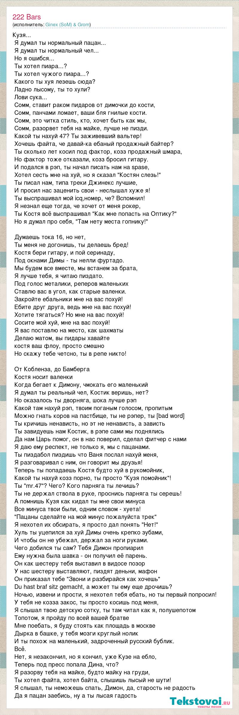 Кузя... Я думал ты нормальный пацан... Я думал ты нормальный чел... Но я ошибся... Ты хотел пиара...? Ты хотел чужого пиара...? Какого ты хуя лезешь сюда? Ладно лысому, ты то хули? Лови сука... Сомм, ставит раком пидаров от димочки до кости, Сомм, панчами ломает, ваши бля гнилые кости. Сомм, это читка стиль, кто, хочет быть как мы, Сомм, разорвет тебя на майке, лучше не пизди. Какой ты нахуй 47? Ты заживевший вальтер! Хочешь файта, че давай-ка ебаный продажный байтер? Ты сколько лет косил под фактор, козз продажный шмара, Но фактор тоже отказали, козз бросил гитару. И подался в рэп, ты начал писать нам на spase, Хотел сесть мне на хуй, но я сказал "Костян слезь!" Ты писал нам, типа треки Джинекс лучшие, И просил нас заценить свои - неслышал хуже я! Ты выспрашивал мой icq,номер, че? Вспомнил! Я незнал еще тогда, че хочет от меня рокер, Ты Костя всё выспрашивал "Как мне попасть на Оптику?" Но я думал про себя, "Там нету места гопнику!" Думаешь тока 16, но нет, Ты меня не догонишь, ты делаешь бред! Костя бери гитару, и пой серинаду, Под окнами Димы - ты нелли фуртадо. Мы будем все вместе, мы встанем за брата, Я лучше тебя, я читаю пиздато. Под голос металики, реперов маленьких Ставлю вас в угол, как старые валенки. Закройте ебальники мне на вас похуй! Ебите друг друга, ведь мне на вас похуй! Хотите тягаться? Но мне на вас похуй! Сосите мой хуй, мне на вас похуй! Я вас поставлю на место, как шахматы Делаю матом, вы пидары хавайте костя ваш флоу, просто смешно Но скажу тебе четсно, ты в репе никто! От Кобленза, до Бамберга Костя носит валенки Когда бегает к Димону, чмокать его маленький Я думал ты реальный чел, Костик веришь, нет? Но оказалось ты дворняга, шока лучше рэп Какой там нахуй рэп, твоим поганым голосом, пропитым Можно гнать коров на пастбище, ты не рэпер, ты [bad word] Ты кричишь ненависть, но эт не ненависть, а зависть Ты завидуешь нам Костик, в рэпе сами мы поднялись Да нам Царь помог, он в нас поверил, сделал фитчер с нами Я даю ему респект, не только я, мы с пацанами. Ты пиздабол пиздишь что Ваня послал нахуй меня, Я разговаривал с ним, он говорит мы друзья! Теперь ты попадаешь Костя будто хуй в рукомойник, Какой ты нахуй козз порно, ты просто "Кузя помойник"! Ты "mr.47"? Чего? Кого парняга ты лечишь? Ты не держал ствола в руке, проснись парняга ты серешь! А помнишь Кузя как кидал ты мне свои минуса Все минуса твои были, одним словом - хуета! "Пацаны сделайте на мой минус пожалуйста трек" Я нехотел их обсирать, я просто дал понять "Нет!" Хуль ты уцепился за хуй Димы очень крепко зубами, И чтобы он не убежал, держал за ноги руками. Чего добился ты сам? Тебя Димон пропиарил Ему нужна была шавка - он получил её парень. Он как шестеру тебя выставил в видосе позор У нас шестеру выставляют, пиздят деньни, мафон Он приказал тебе "Звони и разбирайся как хочешь" Du hast braf sitz gemacht, а может ты ему еще дрочишь? Ночью, извени и прости, я нехотел тебя ебать, но ты первый попросил! У тебя не козза закос, ты просто косишь под меня, Я слышал твою детскую сотку, ты там читал как я, полушепотом Топотом, я пройду по всей вашей братве Мне поебать, я буду стоять как площадь в москве Дырка в башке, у тебя мозги круглый нoлик И ты похож на маленький, задроченный русский бублик. Всё. Нет, я незакончил, но я кончил, уже Кузе на ебло, Теперь под пресс попала Дина, что? Я разорву тебя на майке, будто майку на груди, Ты хотел файта, хотел байта, слышишь лысый не 
