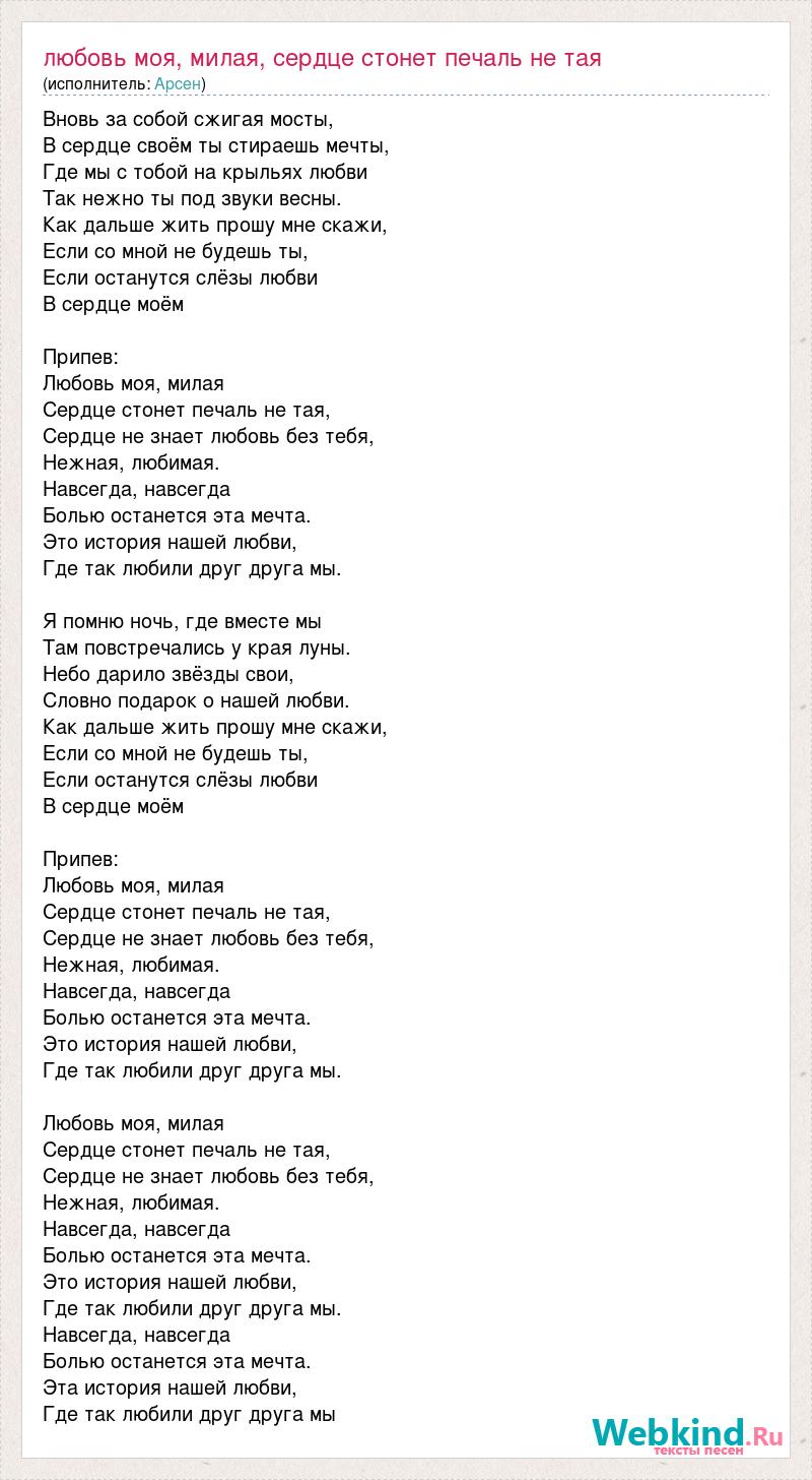 Вновь за собой сжигая мосты, В сердце своём ты стираешь мечты, Где мы с тобой на крыльях любви Так нежно ты под звуки весны. Как дальше жить прошу мне скажи, Если со мной не будешь ты, Если останутся слёзы любви В сердце моём Припев: Любовь моя, милая Сердце стонет печаль не тая, Сердце не знает любовь без тебя, Нежная, любимая. Навсегда, навсегда Болью останется эта мечта. Это история нашей любви, Где так любили друг друга мы. Я помню ночь, где вместе мы Там повстречались у края луны. Небо дарило звёзды свои, Словно подарок о нашей любви. Как дальше жить прошу мне скажи, Если со мной не будешь ты, Если останутся слёзы любви В сердце моём Припев: Любовь моя, милая Сердце стонет печаль не тая, Сердце не знает любовь без тебя, Нежная, любимая. Навсегда, навсегда Болью останется эта мечта. Это история нашей любви, Где так любили друг друга мы. Любовь моя, милая Сердце стонет печаль не тая, Сердце не знает любовь без тебя, Нежная, любимая. Навсегда, навсегда Болью останется эта мечта. Это история нашей любви, Где так любили друг друга мы. Навсегда, навсегда Болью останется эта мечта. Эта история нашей любви, Где так любили друг друга мы