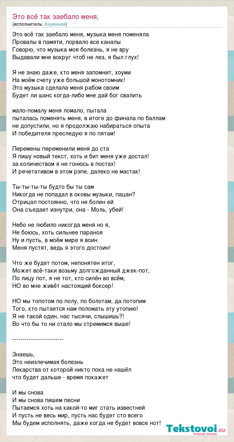 Это всё так заебало меня, музыка меня поменяла Провалы в памяти, порвало все каналы Говорю, что музыка моя болезнь, я не вру Выдавали мне вокруг чтоб не лез, я был глух! Я не знаю даже, кто меня запомнит, хоуми На моём счету уже большой монотомник! Это музыка сделала меня рабом своим Будет ли шанс когда-либо мне дай бог свалить мало-помалу меня ломало, пытала пыталась поменять меня, в итоге до финала по баллам не допустили, но я продолжаю набираться опыта И победителя преследую я по пятам! Перемены переменили меня до ста Я пишу новый текст, хоть и бит меня уже достал! за количеством я не гонюсь в постах! И речетативом в этом рэпе, далеко не мастак! Ты-ты-ты-ты будто бы ты сам Никогда не попадал в оковы музыки, пацан? Отрицал постоянно, что не болен ей Она съедает изнутри, она - Моль, убей! Небо не любило никогда меня но я, Не боюсь, хоть сильнее параноя Ну и пусть, в моём мире я воин Меня пустят, ведь я этого достоин! Что же будет потом, непонятен итог, Может всё-таки возьму долгожданный джек-пот, По лицу пот, я не тот, кто силён во всём, НО во мне живёт настоящий боксер! НО мы топотом по полу, по болотам, да потопим Того, кто пытается нам поломать эту утопию! Я не такой один, нас тысячи, слышишь?! Во что бы то ни стало мы стремимся выше! ------------------------- Знаешь, Это неизлечимая болезнь Лекарства от которой никто пока не нашёл что будет дальше - время покажет И мы снова И мы снова пишем песни Пытаемся хоть на какой-то миг стать известней И пусть не весь мир, пусть нас будет сто всего Мы будем исполнять, даже когда не будет вовсе нот!