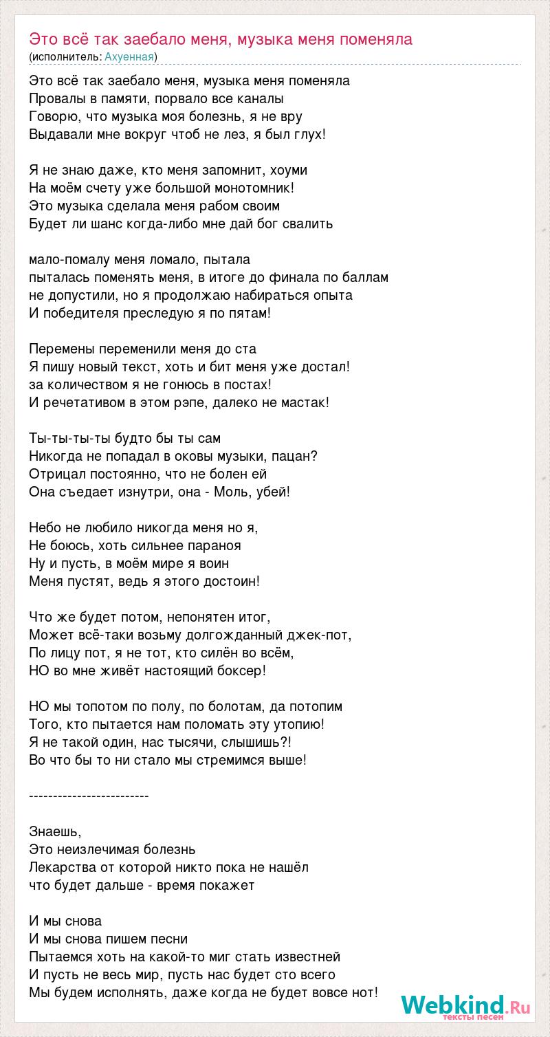 Это всё так заебало меня, музыка меня поменяла Провалы в памяти, порвало все каналы Говорю, что музыка моя болезнь, я не вру Выдавали мне вокруг чтоб не лез, я был глух! Я не знаю даже, кто меня запомнит, хоуми На моём счету уже большой монотомник! Это музыка сделала меня рабом своим Будет ли шанс когда-либо мне дай бог свалить мало-помалу меня ломало, пытала пыталась поменять меня, в итоге до финала по баллам не допустили, но я продолжаю набираться опыта И победителя преследую я по пятам! Перемены переменили меня до ста Я пишу новый текст, хоть и бит меня уже достал! за количеством я не гонюсь в постах! И речетативом в этом рэпе, далеко не мастак! Ты-ты-ты-ты будто бы ты сам Никогда не попадал в оковы музыки, пацан? Отрицал постоянно, что не болен ей Она съедает изнутри, она - Моль, убей! Небо не любило никогда меня но я, Не боюсь, хоть сильнее параноя Ну и пусть, в моём мире я воин Меня пустят, ведь я этого достоин! Что же будет потом, непонятен итог, Может всё-таки возьму долгожданный джек-пот, По лицу пот, я не тот, кто силён во всём, НО во мне живёт настоящий боксер! НО мы топотом по полу, по болотам, да потопим Того, кто пытается нам поломать эту утопию! Я не такой один, нас тысячи, слышишь?! Во что бы то ни стало мы стремимся выше! ------------------------- Знаешь, Это неизлечимая болезнь Лекарства от которой никто пока не нашёл что будет дальше - время покажет И мы снова И мы снова пишем песни Пытаемся хоть на какой-то миг стать известней И пусть не весь мир, пусть нас будет сто всего Мы будем исполнять, даже когда не будет вовсе нот!