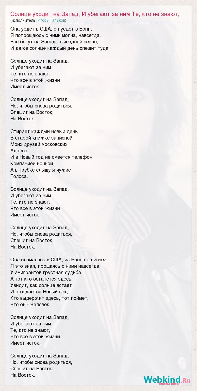 Она уедет в США, он уедет в Бонн, Я попрощаюсь с ними молча, навсегда. Все бегут на Запад - выездной сезон, И даже солнце каждый день спешит туда. Солнце уходит на Запад, И убегают за ним Те, кто не знают, Что все в этой жизни Имеет исток. Солнце уходит на Запад, Но, чтобы снова родиться, Спешит на Восток, На Восток. Стирает каждый новый день В старой книжке записной Моих друзей московских Адреса. И в Новый год не смеется телефон Компанией ночной, А в трубке слышу я чужие Голоса. Солнце уходит на Запад, И убегают за ним Те, кто не знают, Что все в этой жизни Имеет исток. Солнце уходит на Запад, Но, чтобы снова родиться, Спешит на Восток, На Восток. Она сломалась в США, из Бонна он исчез... Я это знал, прощаясь с ними навсегда. У эмигрантов грустная судьба, А тот кто останется здесь, Увидит, как солнце встает И рождается Новый век, Кто выдержит здесь, тот поймет, Что он - Человек. Солнце уходит на Запад, И убегают за ним Те, кто не знают, Что все в этой жизни Имеет исток. Солнце уходит на Запад, Но, чтобы снова родиться, Спешит на Восток, На Восток.