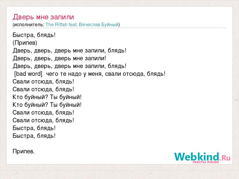 Быстра, блядь! (Припев) Дверь, дверь, дверь мне запили, блядь! Дверь, дверь, дверь мне запили! Дверь, дверь, дверь мне запили, блядь! [bad word] чего те надо у меня, свали отсюда, блядь! Свали отсюда, блядь! Свали отсюда, блядь! Кто буйный? Ты буйный! Кто буйный? Ты буйный! Свали отсюда, блядь! Свали отсюда, блядь! Быстра, блядь! Быстра, блядь! Припев.