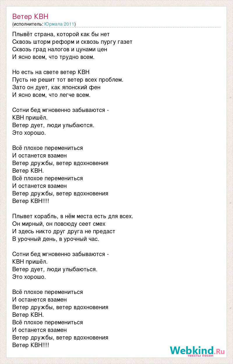 Плывёт страна, которой как бы нет Сквозь шторм реформ и сквозь пургу газет Сквозь град налогов и цунами цен И ясно всем, что трудно всем. Но есть на свете ветер КВН Пусть не решит тот ветер всех проблем. Зато он дует, как японский фен И ясно всем, что легче всем. Сотни бед мгновенно забываются - КВН пришёл. Ветер дует, люди улыбаются. Это хорошо. Всё плохое перемениться И останется взамен Ветер дружбы, ветер вдохновения Ветер КВН. Всё плохое перемениться И останется взамен Ветер дружбы, ветер вдохновения Ветер КВН!!!! Плывет корабль, в нём места есть для всех. Он мирный, он повсюду сеет смех И здесь никто друг друга не предаст В урочный день, в урочный час. Сотни бед мгновенно забываются - КВН пришёл. Ветер дует, люди улыбаються. Это хорошо. Всё плохое перемениться И останется взамен Ветер дружбы, ветер вдохновения Ветер КВН. Всё плохое перемениться И останется взамен Ветер дружбы, ветер вдохновения Ветер КВН!!!!